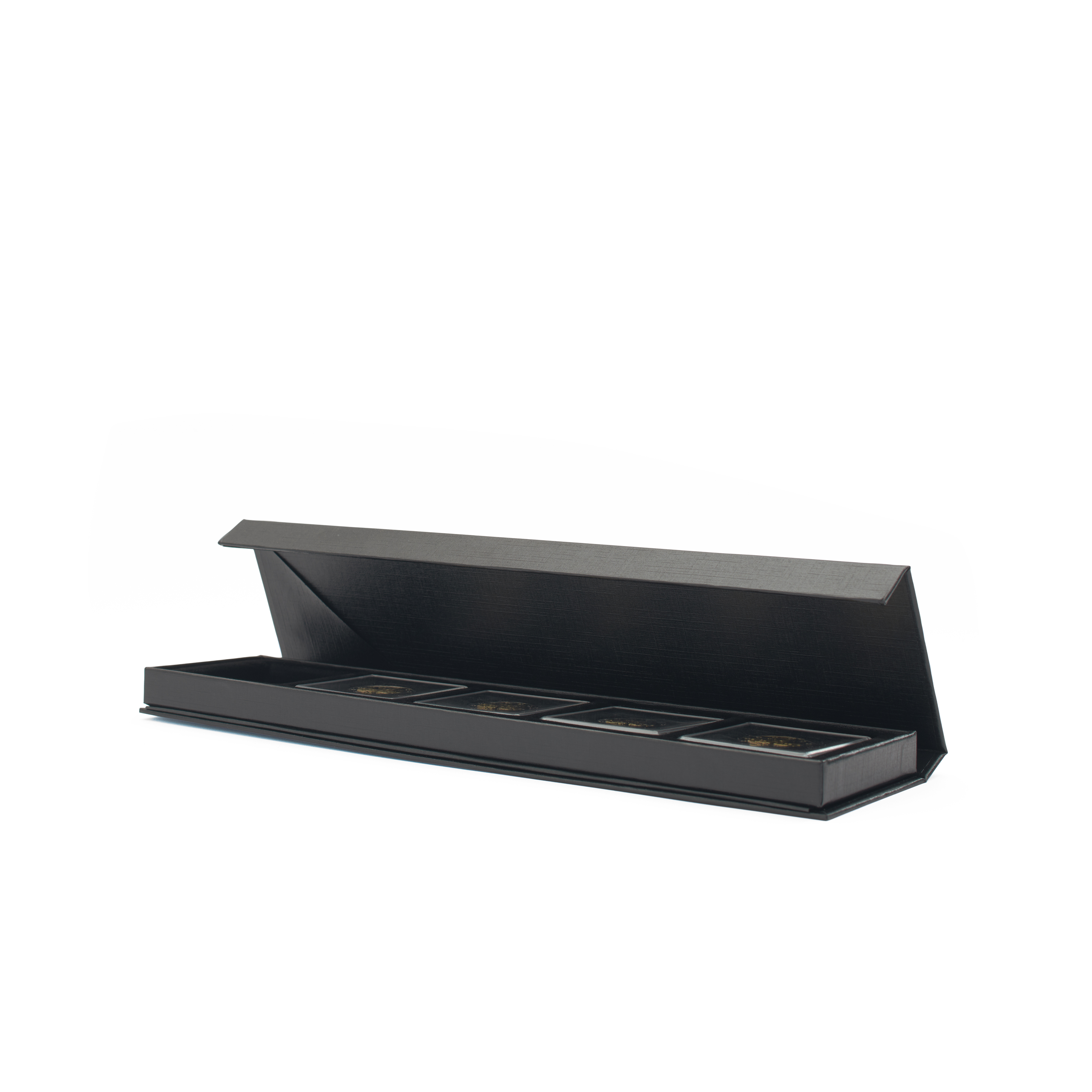 Schwarzes Münzetui aus stabilem Karton für QUADRUM-Kapseln. Der Clou: Mit Aufstellfunktion zur Präsentation der Münzen. Einlage mit schwarzer, veloursartiger Oberfläche. Unauffälliger Magnetverschluss. Kapseln nicht im Lieferumfang enthalten.