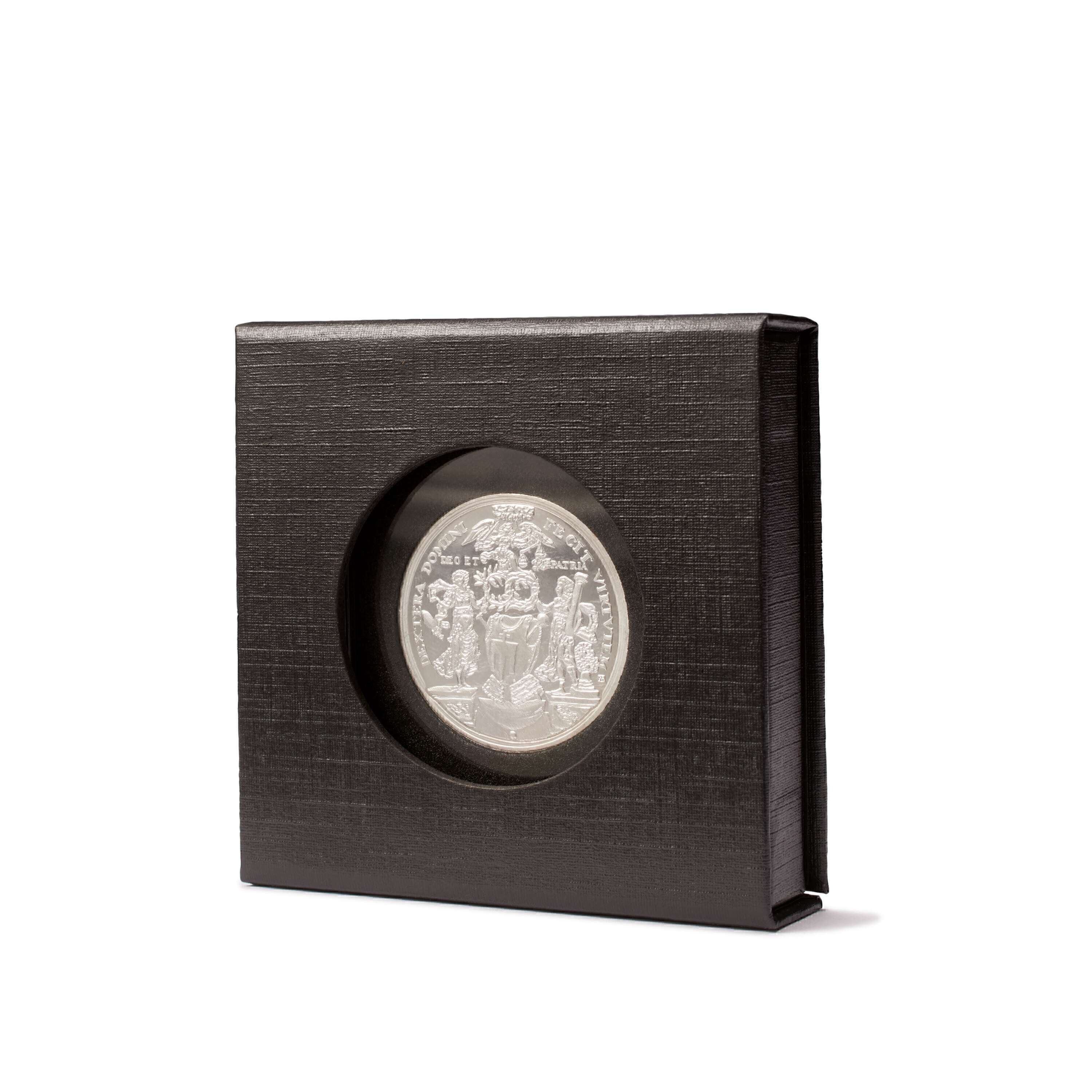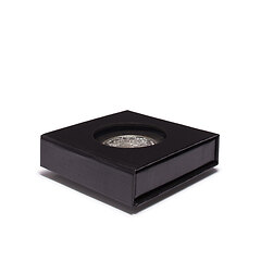 Schwarzes Münzetui aus stabilem Karton für QUADRUM-Kapseln. Der Clou: mit Sichtfenster zum Betrachten und Aufstellfunktion zur Präsentation der Münze. Einlage mit schwarzer, veloursartiger Oberfläche. Unauffälliger Magnetverschluss. Kapseln nicht im Lieferumfang enthalten.
