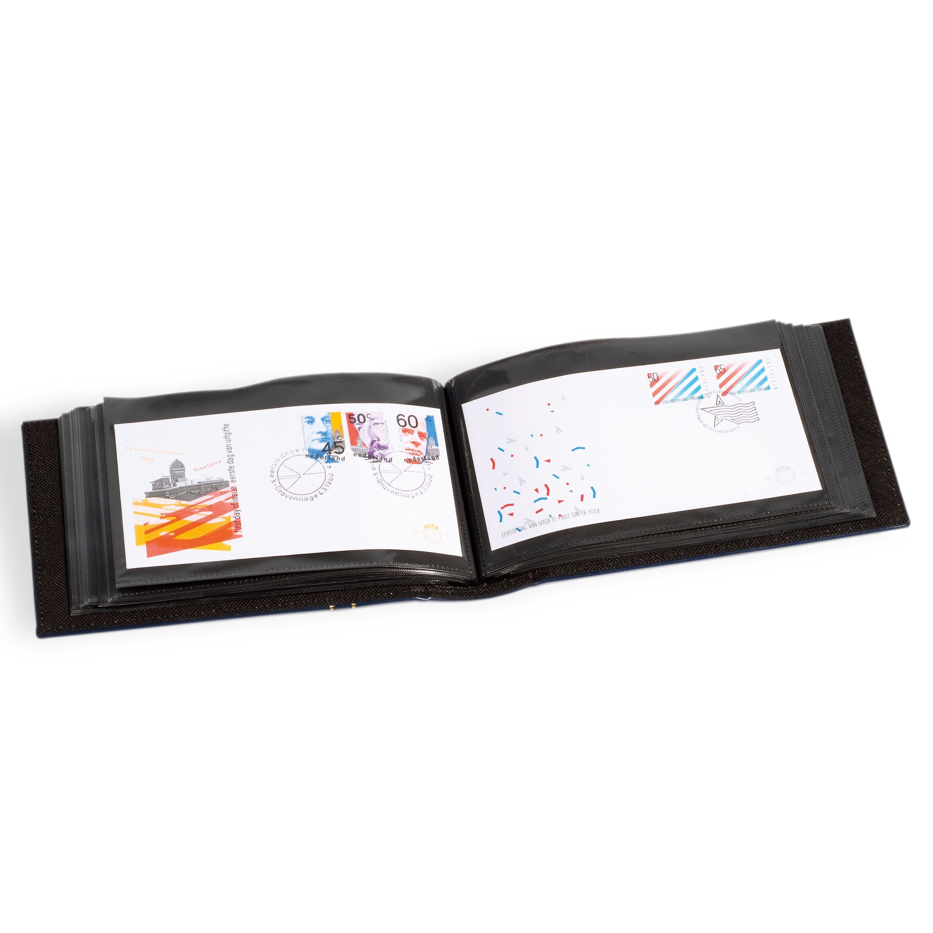 Für große Erstagsbriefe (First-Day-Cover) und große Postkarten. Mit 50 doppelseitigen, klarsichtigen, weichmacherfreien Hüllen, mit eingearbeiteten schwarzen Trennfolien, für 100 Briefe.