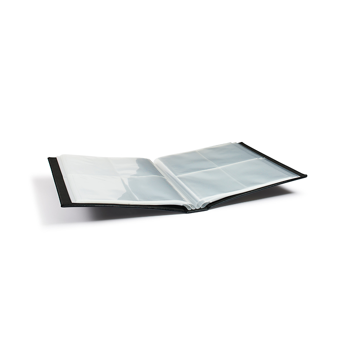 Hochwertiges Postkarten-Album mit 50 festeingebundenen, klarsichtigen Hüllen zur Unterbringung von 400 Postkarten bis zum Format 162 x 114 mm. Jede Hülle fasst bis zu 8 Postkarten (bei beidseitiger Nutzung der stabilen Hüllen). Hochwertige Verarbeitung mit durchgenähten Kanten sowie edlem, lederähnlichem Bezug. Die Hüllen werden seitlich befüllt, wodurch sich die Öffnung der Fächer in der Mitte befinden. Farbe: Schwarz. Außenformat: 290 x 350 x 58 mm