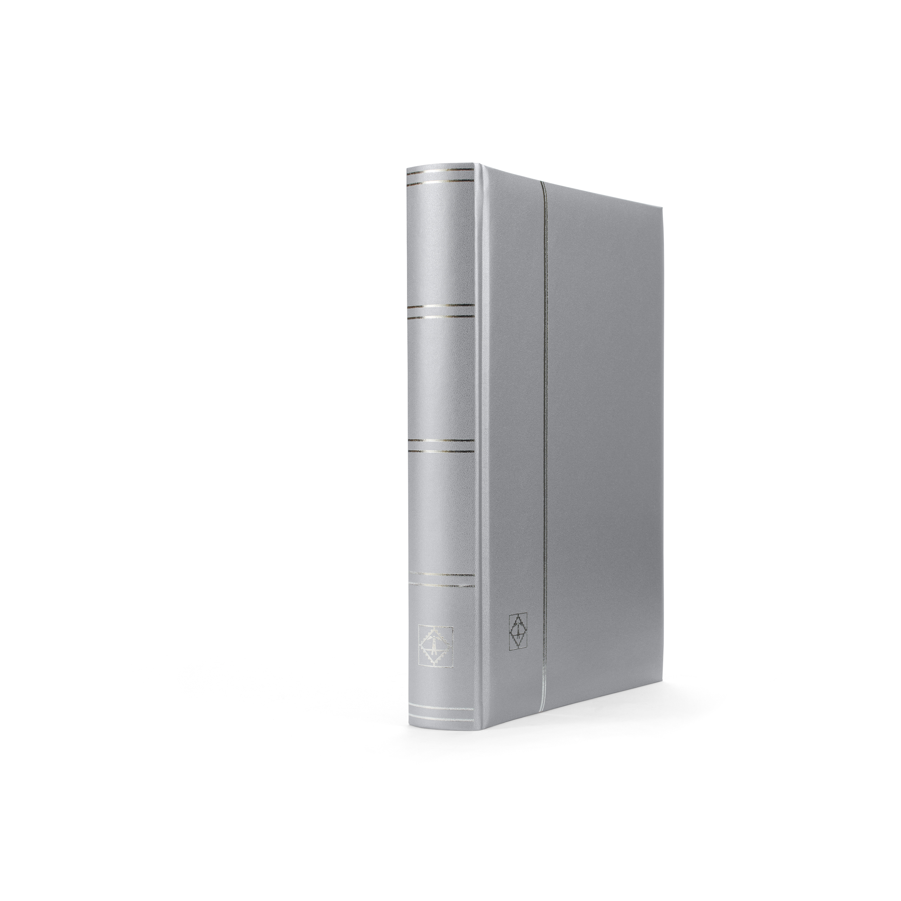 Einsteckbuch A4, 64 schwarze Seiten, wattierter Einband in Metallic-Optik, mit silber- oder goldfarbener Prägung, 9 Klarsichtstreifen pro Seite, doppelte Pergamin-Zwischenblätter, Doppel-Gelenk-Bindung.