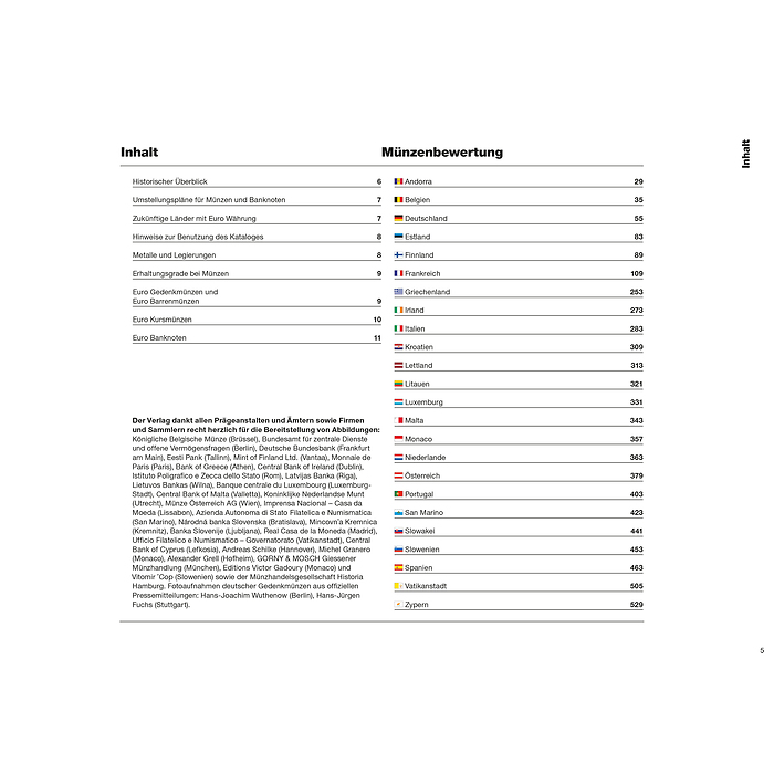 Dieser Katalog bietet eine detaillierte Darstellung aller Banknoten und offiziellen Kursmünzensätze seit der Einführung des Euro in den verschiedenen Ländern. Darüber hinaus finden Sie eine umfassende Zusammenfassung sämtlicher europäischer 2-Euro-Gedenkmünzen sowie eine detaillierte Erfassung der Euro-Banknoten.