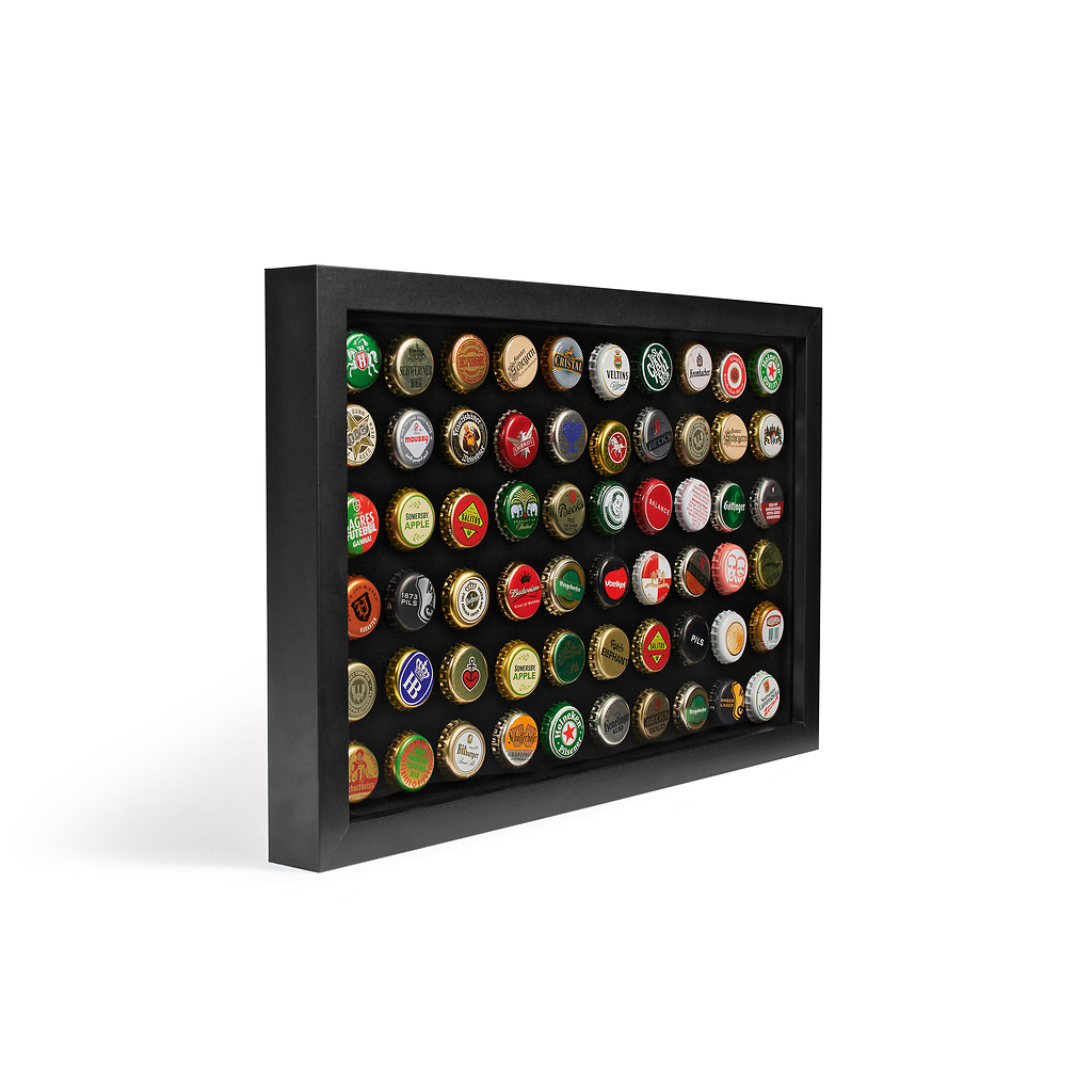 Schwarzer Rahmen zur Präsentation von 60 Champagnerdeckeln oder Kronkorken. Durch das große Glasfenster kommen die Sammelstücke voll zur Geltung. Die schwarze Velourseinlage mit Magnetfunktion ermöglicht ein besonders leichtes Befüllen und verhindert das Verrutschen der Sammelstücke, auch bei senkrechter Haltung. 2 Haken an der Rückseite dienen der Befestigung an der Wand. Senkrechte oder waagerechte Ausrichtung möglich. Auch für Jéroboam-Deckel sowie ungebrauchte Kronkorken geeignet. Außenformat: 403 x 255 x 34 mm.