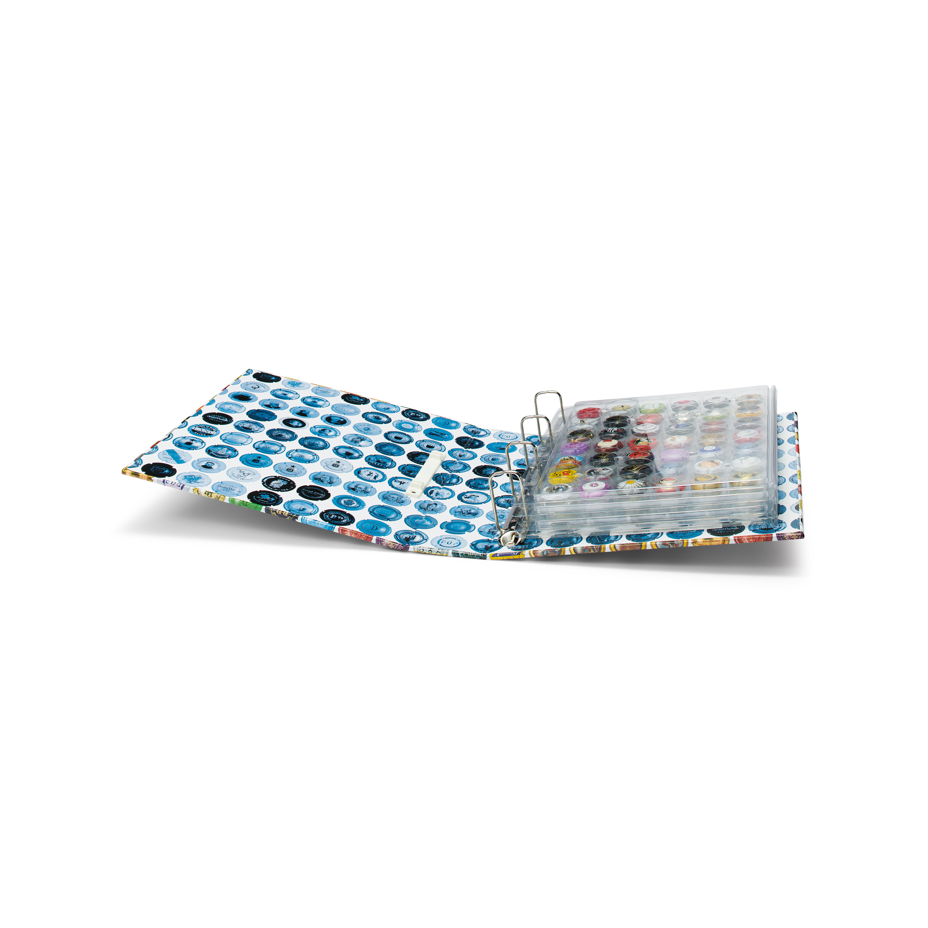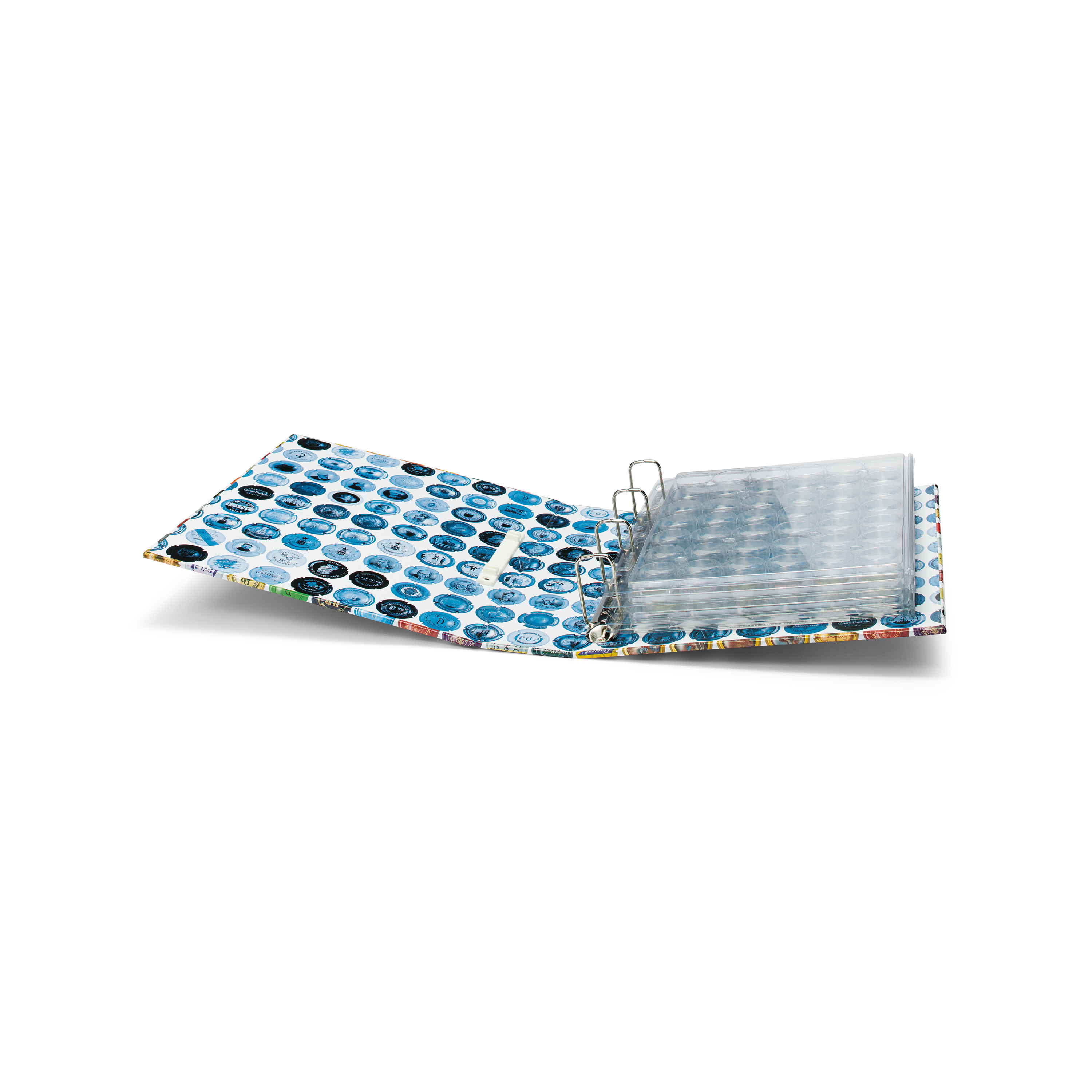 Komplettalbum mit 4 ENCAP-Hüllen für 168 Champagnerdeckel. Das Album kann mit Hilfe von Ersatzhüllen erweitert werden (Gesamt-Füllvermögen: 7 ENCAP-Hüllen = 294 Champagnerdeckel).