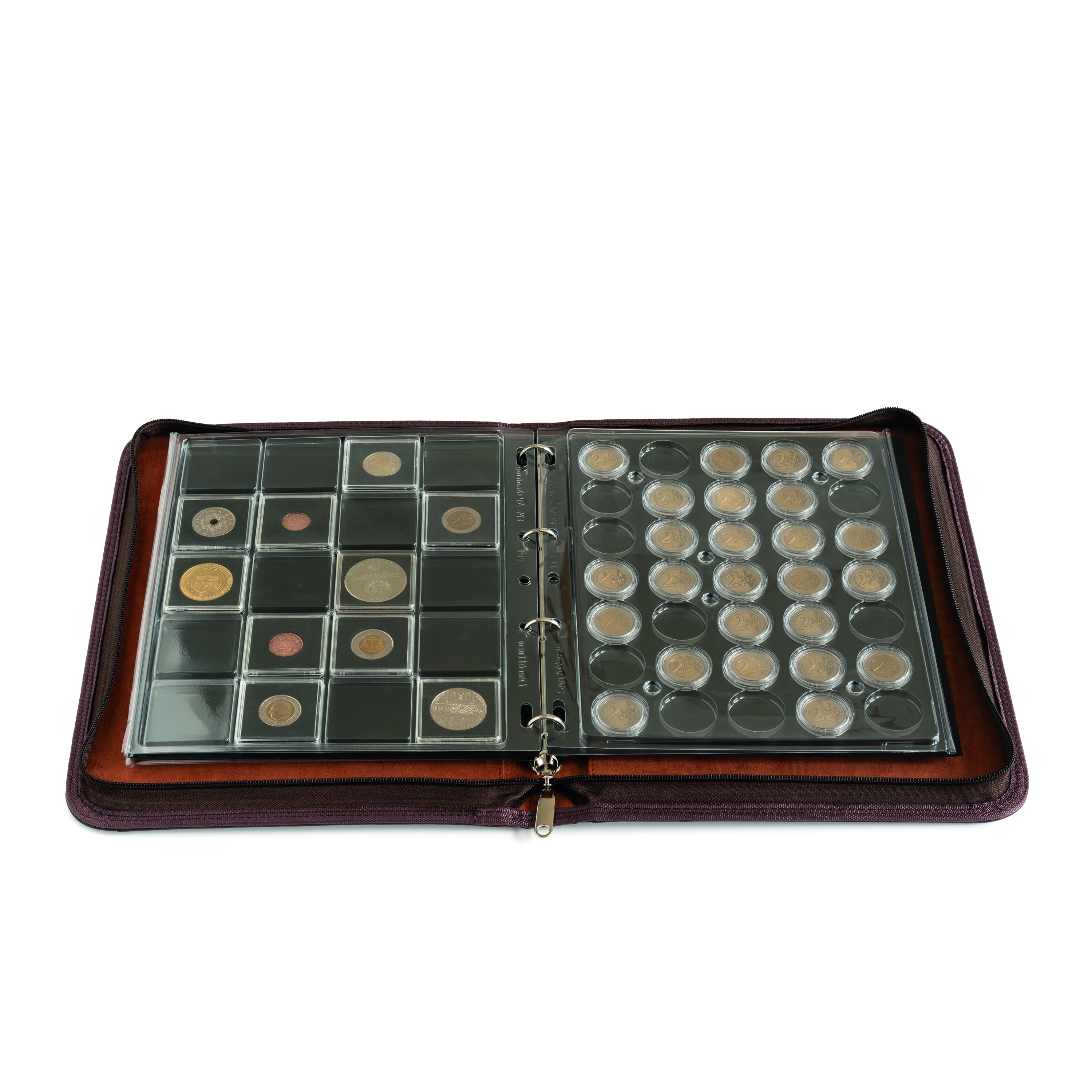 Hochwertige Ringbuchmappe „KURT“ in Leder-Optik zur Aufbewahrung von Münzen, Briefmarken, Banknoten, Postkarten u.v.m. Mit dem stabilen Reißverschluss ist Ihre Sammlung optimal vor Schäden und Verlusten geschützt. Fassungsvermögen: bis zu 30 GRANDE-Hüllen oder 3 ENCAP-Münzhüllen. Stabile 4-D-Ringmechanik. Außenformat geschlossen: 350 x 270 x 35 mm. Ohne Hüllen.