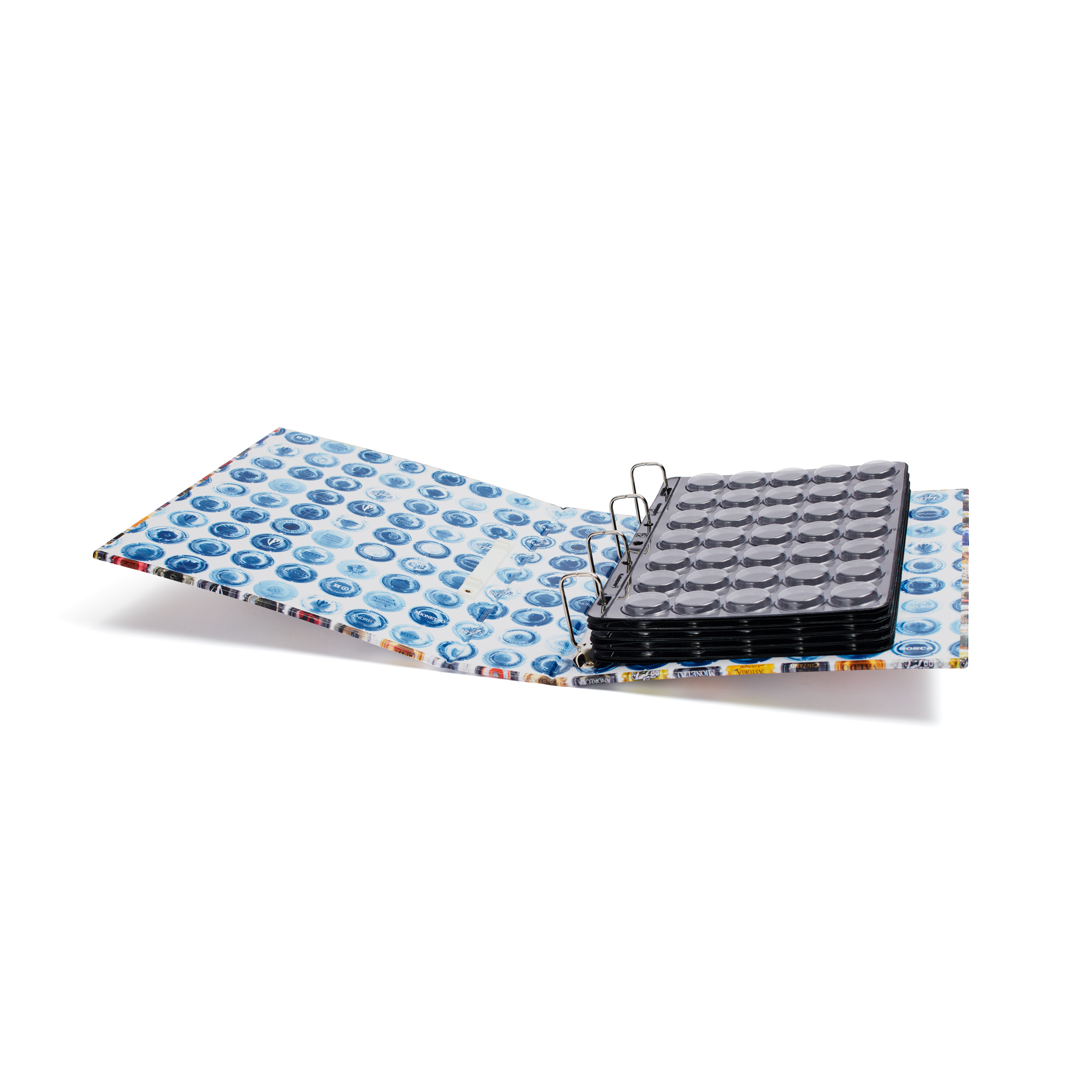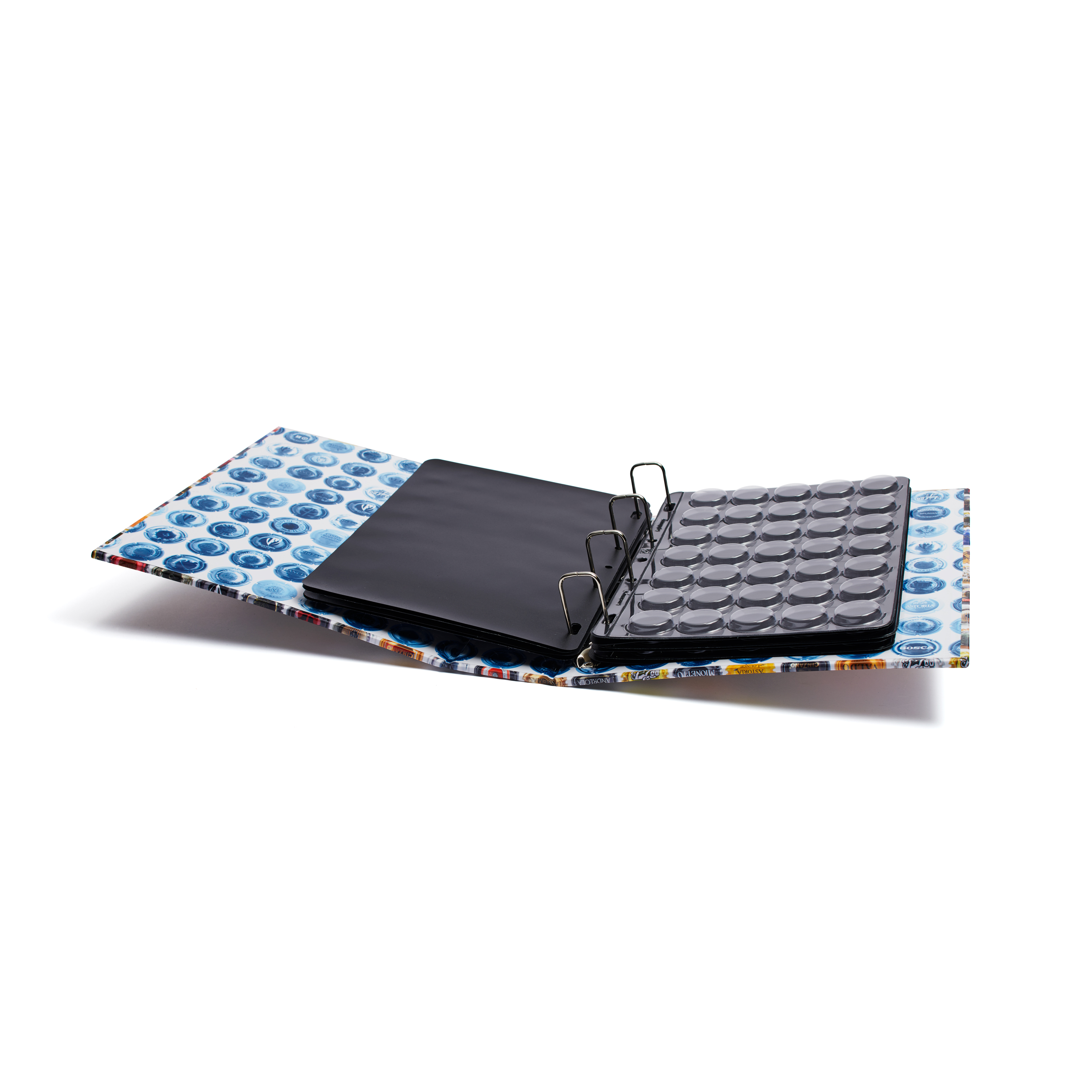 Dieses Album für Spumantedeckel ist ideal, um Sammlungen sicher und übersichtlich zu verwahren. Es enthält fünf schwarze Compart 42-Hüllen, die jeweils Platz für 42 Deckel bieten, sowie fünf Zwischenseiten zur klaren Trennung der Hüllen. Die Deckel werden vorsichtig von hinten in die vorgesehenen Aussparungen eingelegt. Die robuste 4-Ringmechanik ermöglicht eine einfache Handhabung und lässt sich bei Bedarf auf bis zu neun Hüllen (378 Deckel) erweitern. Mit großzügigen Außenmaßen von 280 x 325 x 77 mm bietet das Album ausreichend Raum, um die Sammlung optimal zu organisieren.