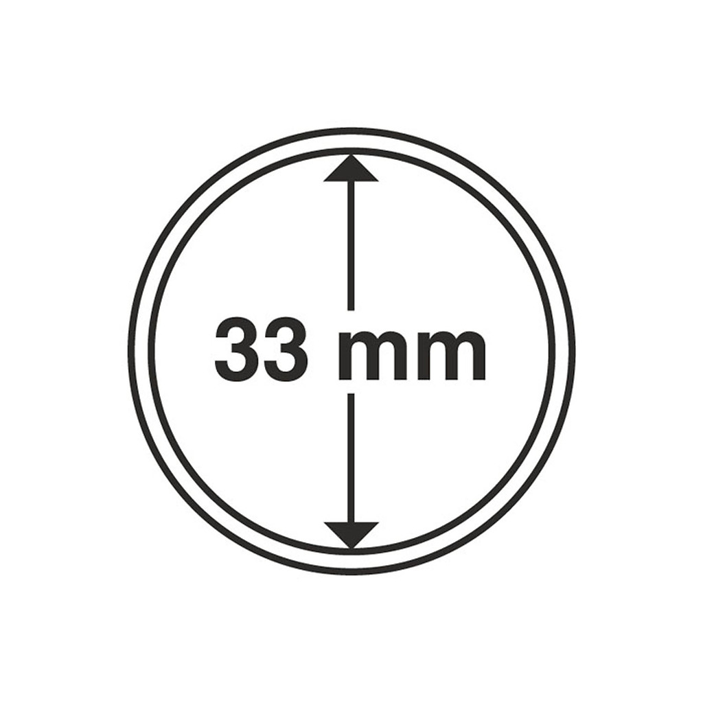 Original Münzkapseln von Leuchtturm - der optimale Schutz für Ihre Münzen. Gefertigt aus hochwertigem, kratzfestem Kunststoff. Farbe: Glasklar. Die Kapseln lassen sich aufgrund des Außenrandes leicht öffnen und verfügen dennoch über einen sicheren Verschluß. Innendurchmesser: 33 mm Außendurchmesser 39 mm. Innenhöhe: ca. 2,9 mm