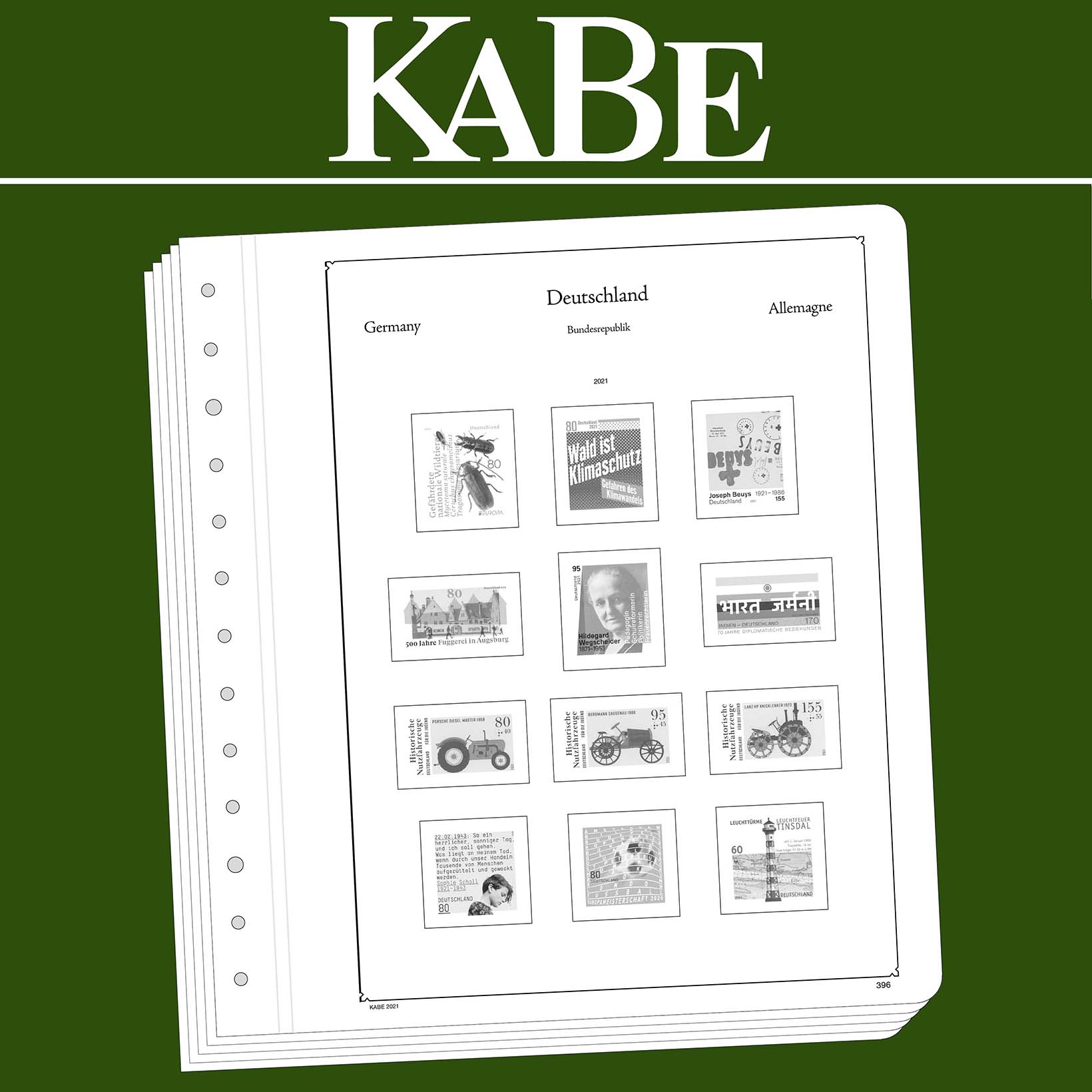KABE Vordruckblätter (Format 275 x 310 mm) werden im detailgetreuen schwarz–weiß Offsetdruckauf alterungsbeständigem, holz- und säurefreiem Karton (175 g/m 2 ) gedruckt. Wir verzichten bewusst auf einen Farbdruck. Dies dient als Orientierungshilfe, damit Sie auf einen Blick sehen, welche Marken Ihnen noch fehlen. In der Größe des Markenvordrucks sind SF-Schutztaschen aus weichmacherfreier, glasklarer, entspiegelter Polystyrol-Folie auf den Albenkarton geklebt. Die Schutztaschen halten die Briefmarken präzise an ihrem Platz und verhindern ein Festkleben. Gleichzeitig bieten sie auch einen optimalen Schutz gegen Staub und Beschädigungen. Das doppelte Leinengelenk sorgt für eine optimale Planlage sowie eine lange Haltbarkeit für Ihre Vordruckblätter.