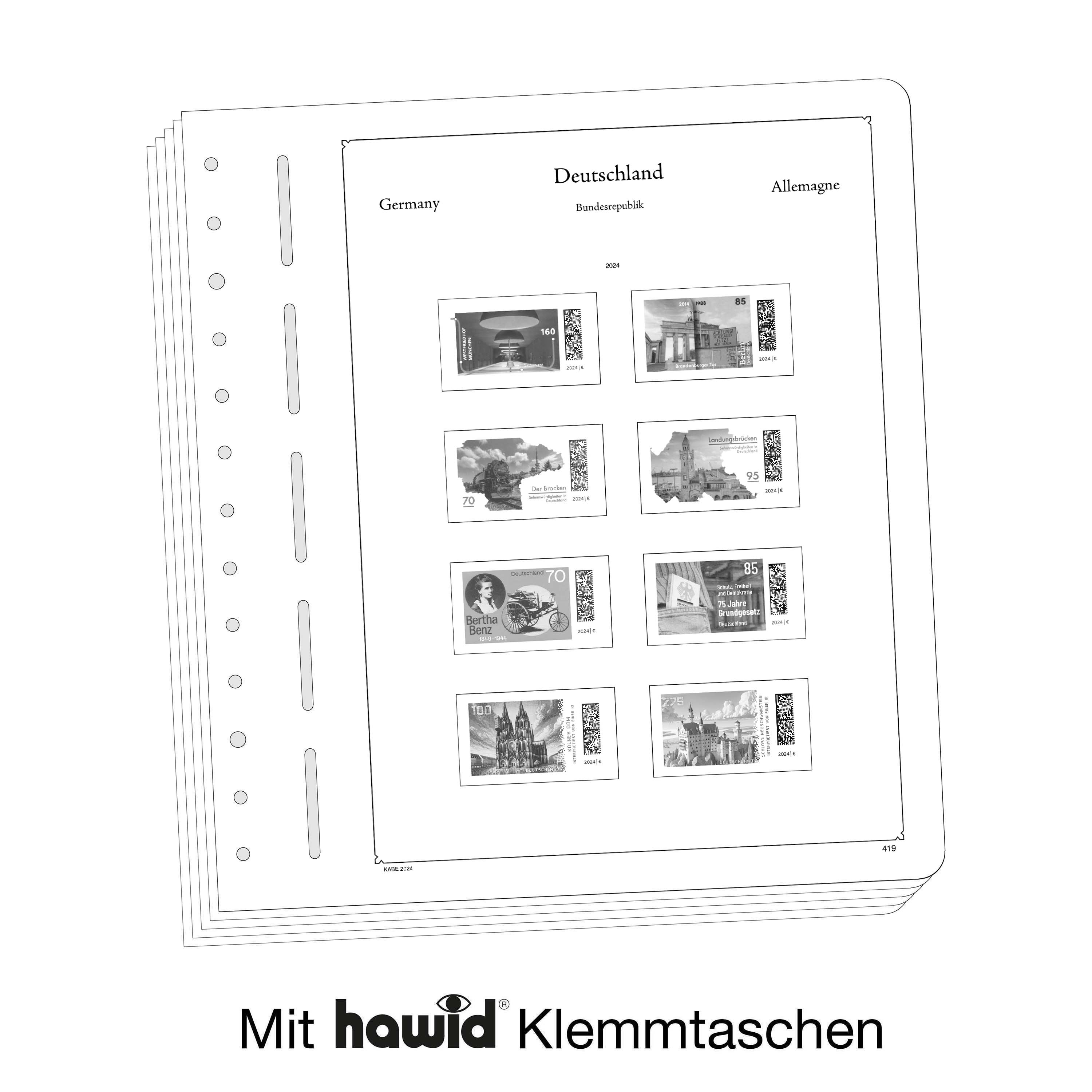 KABE Vordruckblätter (Format 275 x 310 mm) werden im detailgetreuen schwarz–weiß Offsetdruckauf alterungsbeständigem, holz- und säurefreiem Karton (175 g/m 2 ) gedruckt. Wir verzichten bewusst auf einen Farbdruck. Dies dient als Orientierungshilfe, damit Sie auf einen Blick sehen, welche Marken Ihnen noch fehlen. In der Größe des Markenvordrucks sind SF-Schutztaschen aus weichmacherfreier, glasklarer, entspiegelter Polystyrol-Folie auf den Albenkarton geklebt. Die Schutztaschen halten die Briefmarken präzise an ihrem Platz und verhindern ein Festkleben. Gleichzeitig bieten sie auch einen optimalen Schutz gegen Staub und Beschädigungen. Das doppelte Leinengelenk sorgt für eine optimale Planlage sowie eine lange Haltbarkeit für Ihre Vordruckblätter.