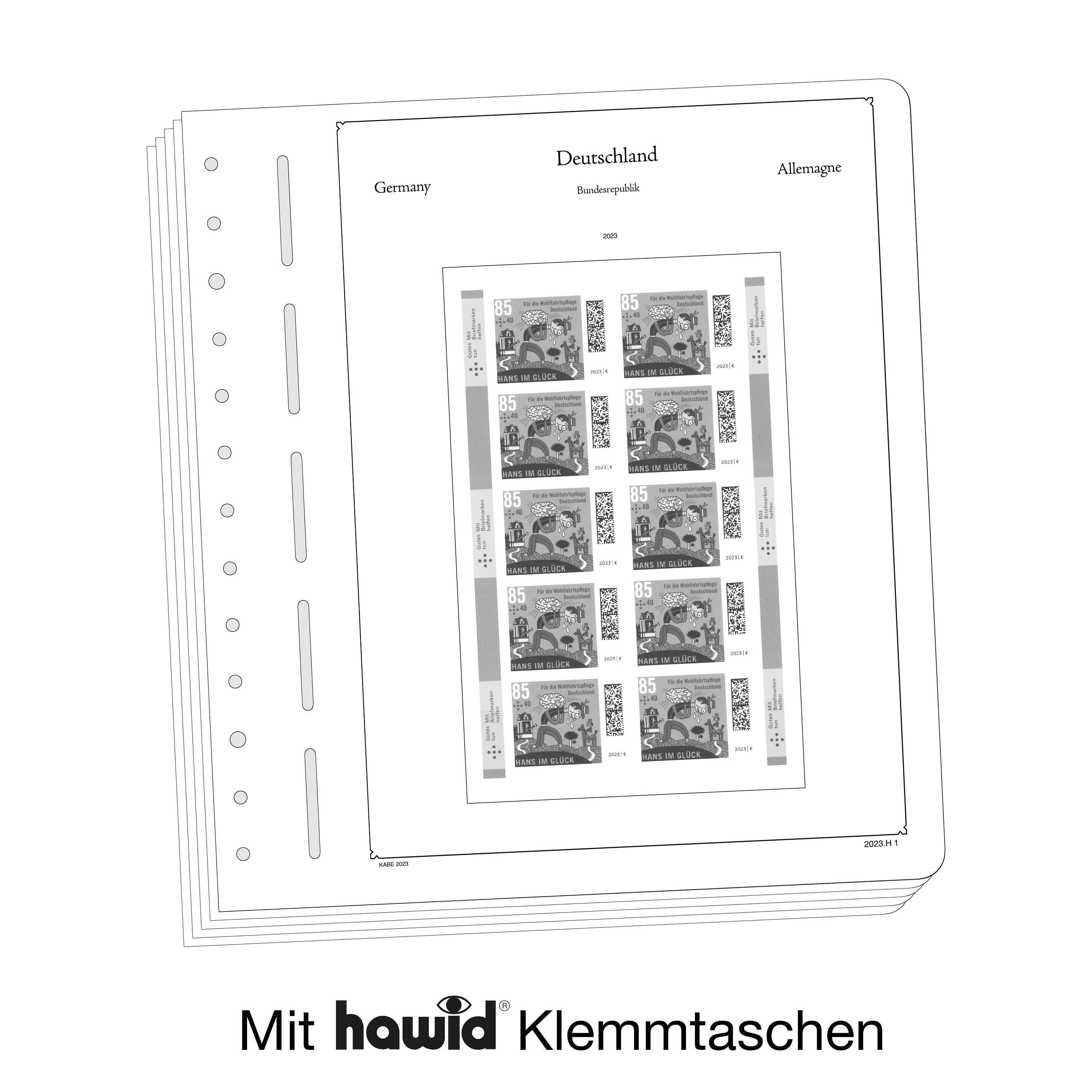 KABE Vordruckblätter (Format 275 x 310 mm) werden im detailgetreuen schwarz–weiß Offsetdruckauf alterungsbeständigem, holz- und säurefreiem Karton (175 g/m 2 ) gedruckt. Wir verzichten bewusst auf einen Farbdruck. Dies dient als Orientierungshilfe, damit Sie auf einen Blick sehen, welche Marken Ihnen noch fehlen. In der Größe des Markenvordrucks sind SF-Schutztaschen aus weichmacherfreier, glasklarer, entspiegelter Polystyrol-Folie auf den Albenkarton geklebt. Die Schutztaschen halten die Briefmarken präzise an ihrem Platz und verhindern ein Festkleben. Gleichzeitig bieten sie auch einen optimalen Schutz gegen Staub und Beschädigungen. Das doppelte Leinengelenk sorgt für eine optimale Planlage sowie eine lange Haltbarkeit für Ihre Vordruckblätter.