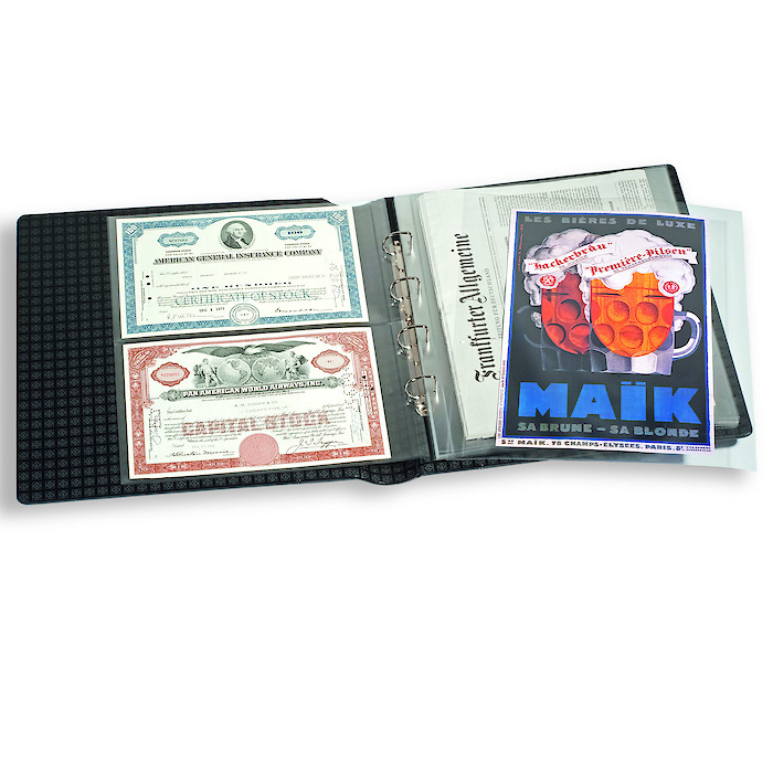 Glasklare Kunststoffhüllen zur Aufbewahrung von Dokumenten bis 330 x 420 mm, z.B. Format A3. Aufbewahrt werden die Hüllen in dem dazu passenden KANZLEI-Binder. Vorteil: die Hüllen sind aus (weichmacher- und säurefreiem) Polyester gefertigt, das neben der perfekten Präsentation einen größtmöglichen Schutz für Ihre Sammelobjekte gewährleistet. Außenformat: 360 x 430 mm.