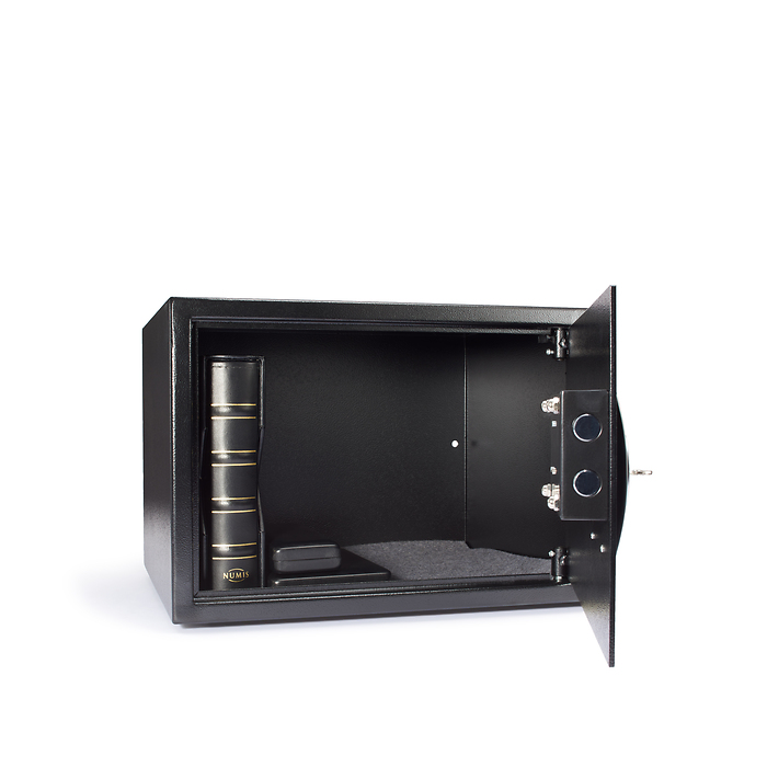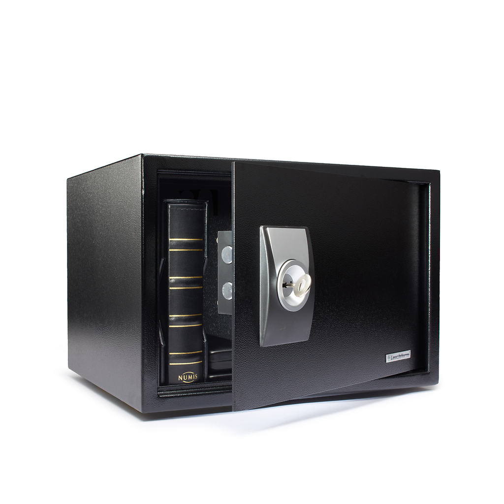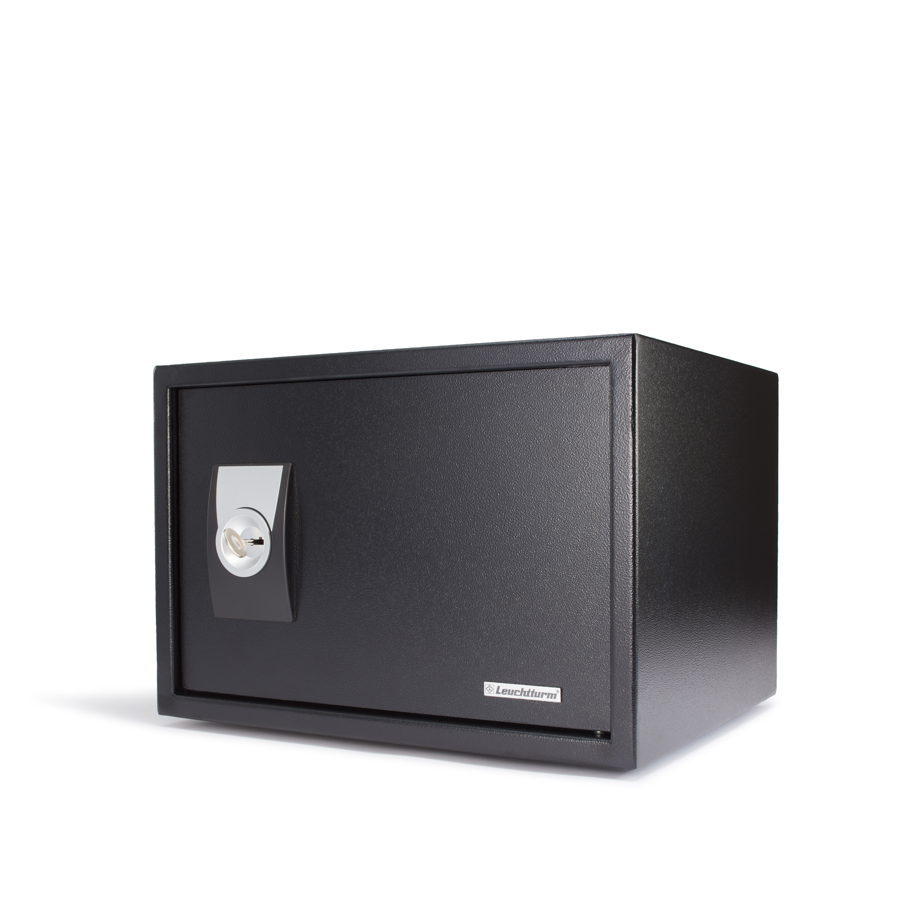Schützen Sie Ihre Schätze vor unerlaubtem Zugriff und Diebstahl mit dem LEUCHTTURM Tresor KAVENT. Die Wände des Tresors bestehen aus 2 mm starkem Stahl, die Tür aus 4 mm starkem Stahl. Der Verschluss erfolgt über einen Doppelbart-Schlüssel und 2 solide Stahlbolzen. Dank seiner speziell angepassten Innenmaße bietet der Tresor Platz für z.B. A4 Büro-Ordner, 3 Ringbinder GRANDE inkl. Schutzkassette, 7 Ringbinder NUMIS inkl. Schutzkassette (stehend), 13 Münzboxen MB, 8 Holzmünzkassetten VOLTERRA UNO, Einsteckbücher, Drehstabbinder PERFECT, Klemmbinder LUXUS, Ringbinder EXCELLENT uvm. Im Inneren schützt eine weiche Filzmatte auf dem Boden Ihren Besitz vor Kratzern o.ä. Sowohl in der Rückwand als auch im Boden des Tresors befinden sich jeweils zwei Schraubenöffnungen. Das ermöglicht eine Befestigung des Tresors entweder an der Wand bzw. an der Schrankwand oder im Boden bzw. auf einem Regalbrett. Das in der Lieferung inkludierte Montagematerial ist nur zur Sicherung des Tresors an einem Gegenstand gedacht und dient nicht der Aufhängung des Tresors an sich. Mitgeliefert werden 2 Doppelbart-Schlüssel mit individueller Schlüsselnummer, die ausschließlich auf das eingebaute Schloss passen. Gewicht: 13,5 kg. Maße der Türöffnung: 355 x 240 mm (L x H). Innenmaße*: 425 x 290 x 340 mm (L x H x T). Außenmaße: 430 x 295 x 360 mm (L x H x T).