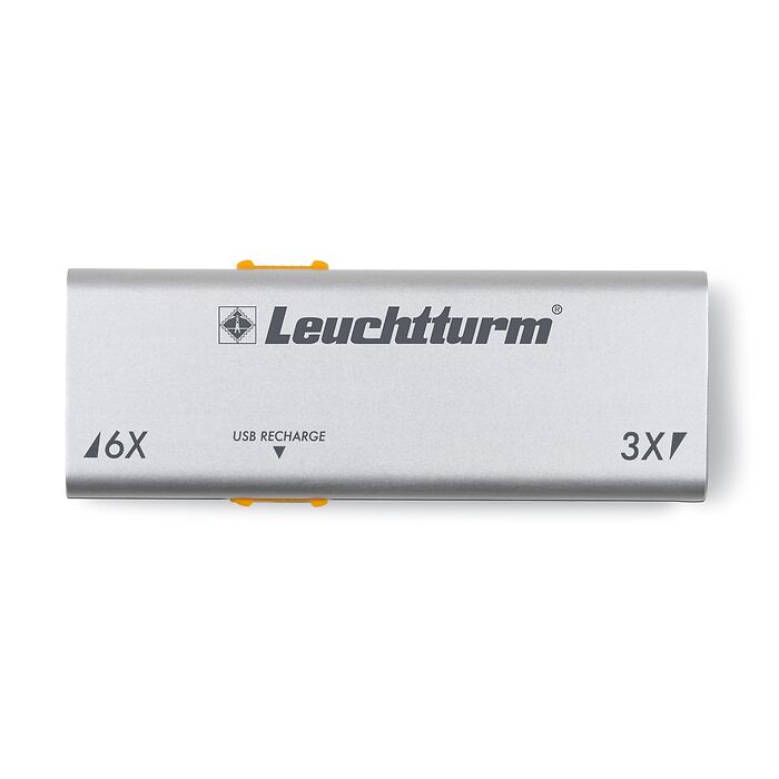 LED-Aufziehlupe DUPLEX mit 3-facher und 6-facher Vergrößerung. 2 Linsen aus hochwertigem Acrylglas, einzeln herausziehbar. Maße Linse 6x: 25 x 16 mm, Maße Linse 3x: 25 x 50 mm. Silberfarbenes Aluminiumgehäuse, wodurch die Lupe äußerst robust und gleichzeitig sehr leicht ist. Mit jeweils 1 weißen LED pro Linse. Zum Aktivieren der LED muss die Linse vollständig, über den Widerstand hinaus aus dem Gehäuse gezogen werden. Wiederaufladbarer Akku, wodurch das Batteriewechseln entfällt. Mit USB-Anschluss, inkl. USB-Ladekabel. Außenformat (geschlossen): 102 x 40 x 11 mm.