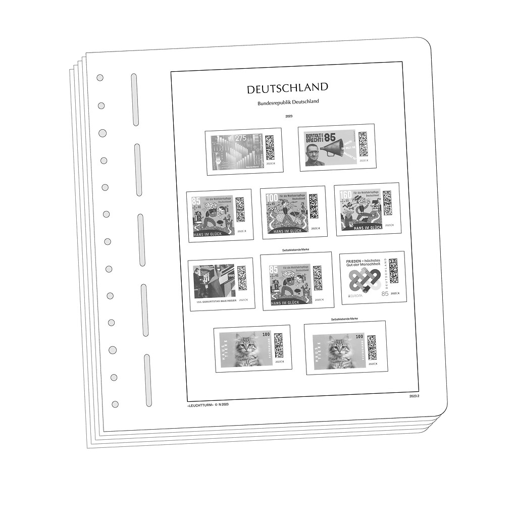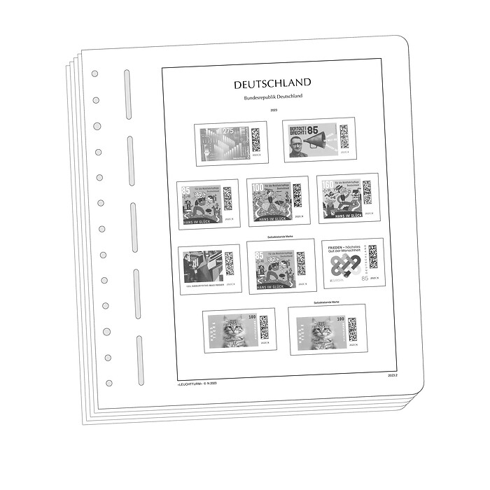 LEUCHTTURM Albenblätter (Format 270 x 297 mm/ 13-Loch-System) werden im detailgetreuen schwarz–weiß Offsetdruckauf alterungsbeständigem, holz- und säurefreiem Karton (170 g/m 2 ) gedruckt. Wir verzichten bewusst auf einen Farbdruck. Dies dient als Orientierungshilfe, damit Sie auf einen Blick sehen, welche Marken Ihnen noch fehlen. In der Größe des Markenvordrucks sind SF-Schutztaschen aus weichmacherfreier, glasklarer, entspiegelter Polystyrol-Folie auf den Albenkarton geklebt. Die Schutztaschen halten die Briefmarken präzise an ihrem Platz und verhindern ein Festkleben. Gleichzeitig bieten sie auch einen optimalen Schutz gegen Staub und Beschädigungen.