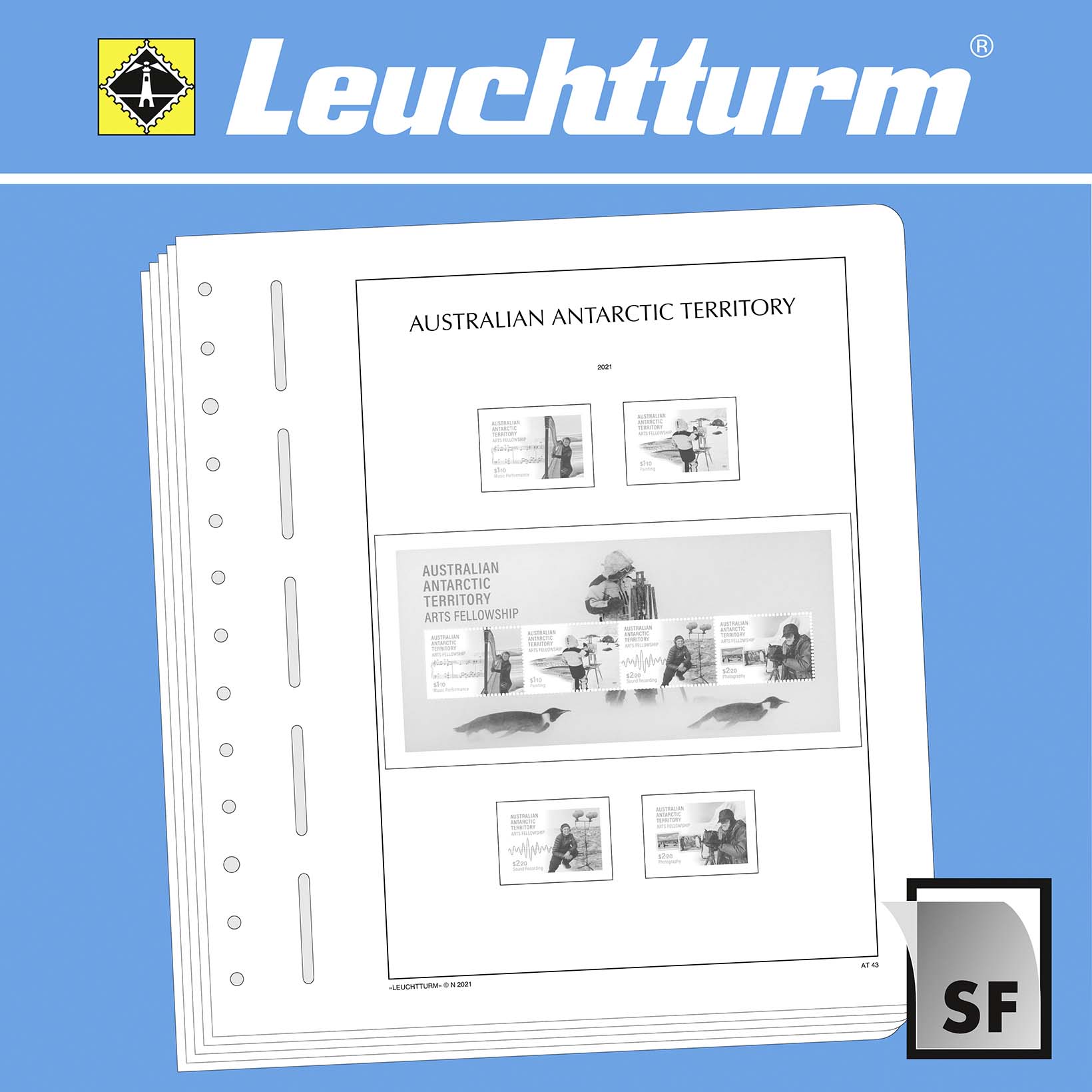 LEUCHTTURM Albenblätter (Format 270 x 297 mm/ 13-Loch-System) werden im detailgetreuen schwarz–weiß Offsetdruckauf alterungsbeständigem, holz- und säurefreiem Karton (170 g/m 2 ) gedruckt. Wir verzichten bewusst auf einen Farbdruck. Dies dient als Orientierungshilfe, damit Sie auf einen Blick sehen, welche Marken Ihnen noch fehlen. In der Größe des Markenvordrucks sind SF-Schutztaschen aus weichmacherfreier, glasklarer, entspiegelter Polystyrol-Folie auf den Albenkarton geklebt. Die Schutztaschen halten die Briefmarken präzise an ihrem Platz und verhindern ein Festkleben. Gleichzeitig bieten sie auch einen optimalen Schutz gegen Staub und Beschädigungen.