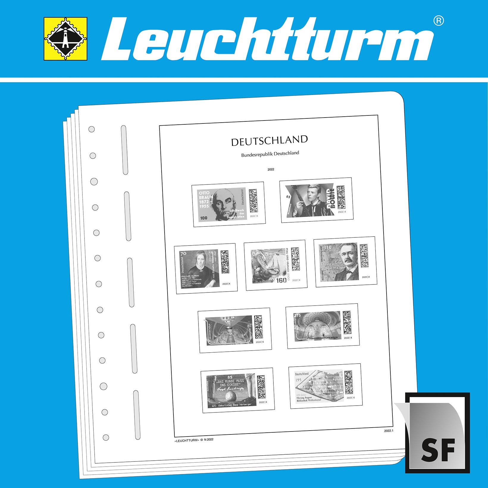 LEUCHTTURM Albenblätter (Format 270 x 297 mm/ 13-Loch-System) werden im detailgetreuen schwarz–weiß Offsetdruckauf alterungsbeständigem, holz- und säurefreiem Karton (170 g/m 2 ) gedruckt. Wir verzichten bewusst auf einen Farbdruck. Dies dient als Orientierungshilfe, damit Sie auf einen Blick sehen, welche Marken Ihnen noch fehlen. In der Größe des Markenvordrucks sind SF-Schutztaschen aus weichmacherfreier, glasklarer, entspiegelter Polystyrol-Folie auf den Albenkarton geklebt. Die Schutztaschen halten die Briefmarken präzise an ihrem Platz und verhindern ein Festkleben. Gleichzeitig bieten sie auch einen optimalen Schutz gegen Staub und Beschädigungen.