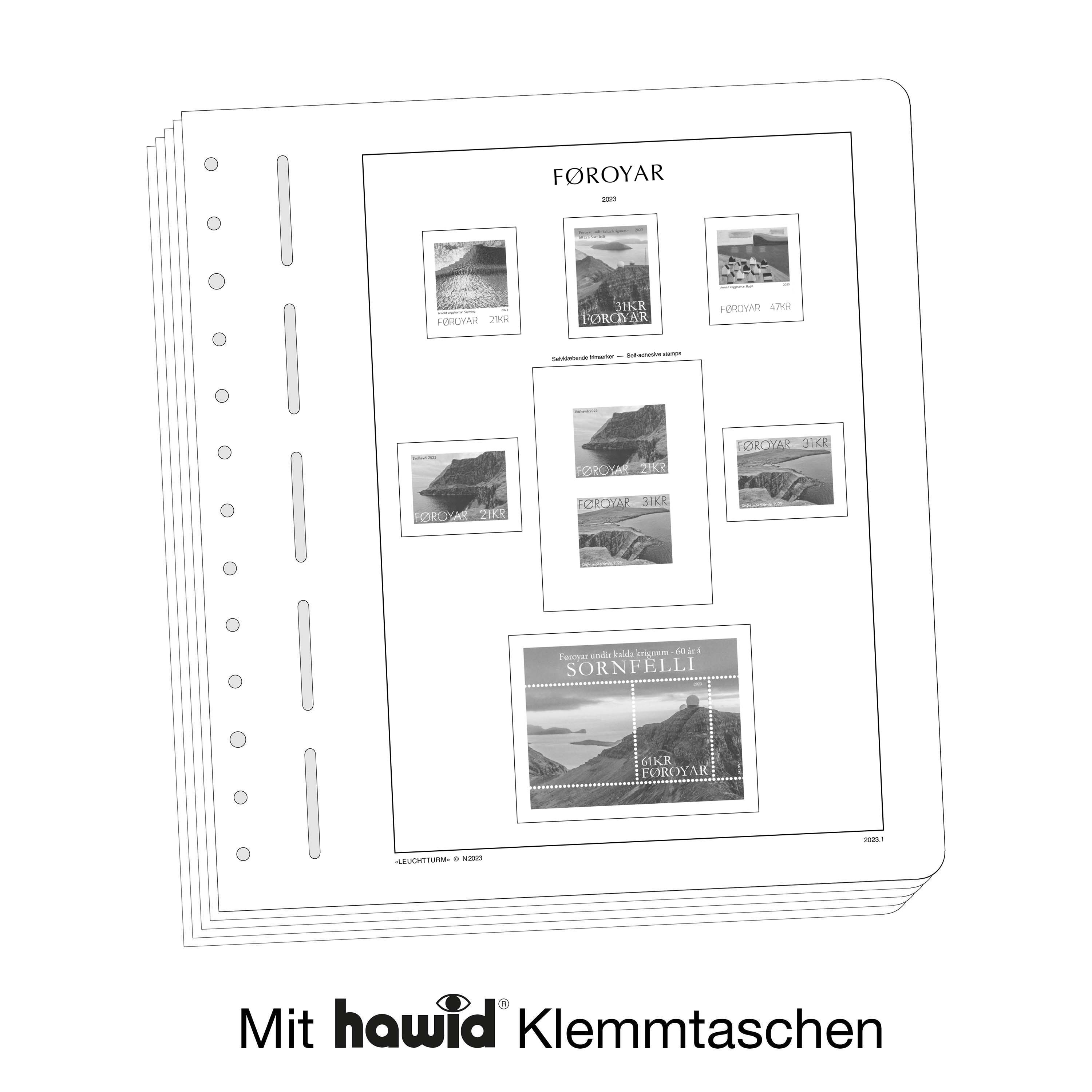 LEUCHTTURM Albenblätter (Format 270 x 297 mm/ 13-Loch-System) werden im detailgetreuen schwarz–weiß Offsetdruckauf alterungsbeständigem, holz- und säurefreiem Karton (170 g/m 2 ) gedruckt. Wir verzichten bewusst auf einen Farbdruck. Dies dient als Orientierungshilfe, damit Sie auf einen Blick sehen, welche Marken Ihnen noch fehlen. In der Größe des Markenvordrucks sind