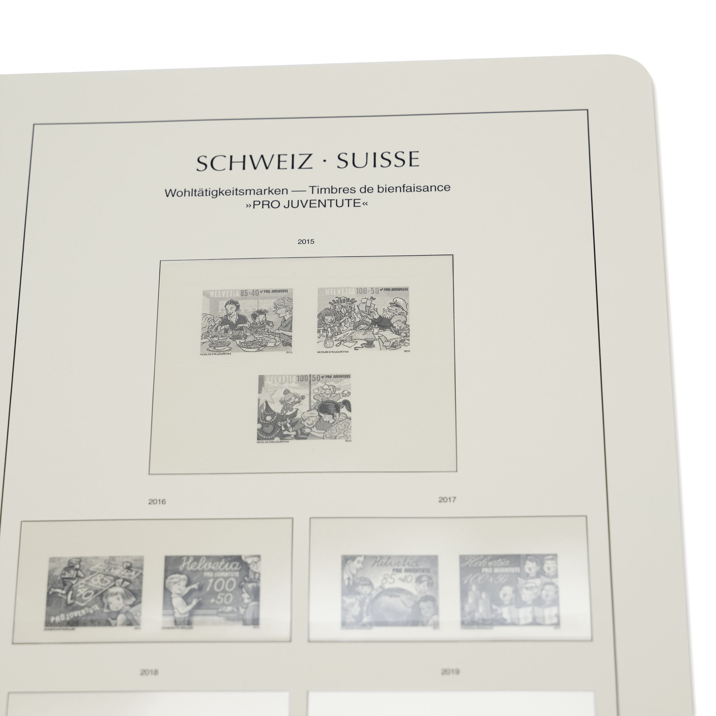 LEUCHTTURM Albenblätter (Format 270 x 297 mm/ 13-Loch-System) werden im detailgetreuen schwarz–weiß Offsetdruckauf alterungsbeständigem, holz- und säurefreiem Karton (170 g/m 2 ) gedruckt. Wir verzichten bewusst auf einen Farbdruck. Dies dient als Orientierungshilfe, damit Sie auf einen Blick sehen, welche Marken Ihnen noch fehlen. In der Größe des Markenvordrucks sind SF-Schutztaschen aus weichmacherfreier, glasklarer, entspiegelter Polystyrol-Folie auf den Albenkarton geklebt. Die Schutztaschen halten die Briefmarken präzise an ihrem Platz und verhindern ein Festkleben. Gleichzeitig bieten sie auch einen optimalen Schutz gegen Staub und Beschädigungen.