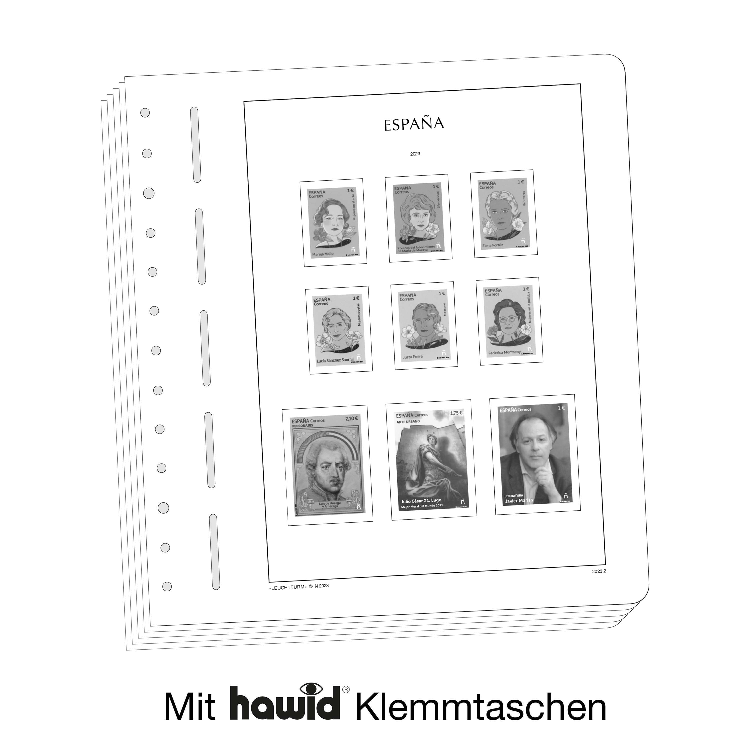 LEUCHTTURM Albenblätter (Format 270 x 297 mm/ 13-Loch-System) werden im detailgetreuen schwarz–weiß Offsetdruckauf alterungsbeständigem, holz- und säurefreiem Karton (170 g/m 2 ) gedruckt. Wir verzichten bewusst auf einen Farbdruck. Dies dient als Orientierungshilfe, damit Sie auf einen Blick sehen, welche Marken Ihnen noch fehlen. In der Größe des Markenvordrucks sind SF-Schutztaschen aus weichmacherfreier, glasklarer, entspiegelter Polystyrol-Folie auf den Albenkarton geklebt. Die Schutztaschen halten die Briefmarken präzise an ihrem Platz und verhindern ein Festkleben. Gleichzeitig bieten sie auch einen optimalen Schutz gegen Staub und Beschädigungen.