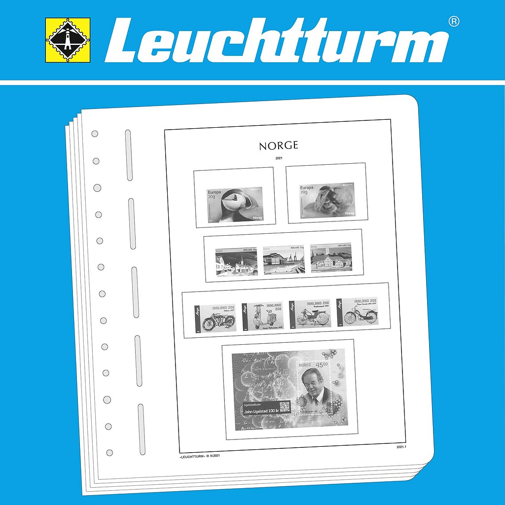 LEUCHTTURM Albenblätter (Format 270 x 297 mm/ 13-Loch-System) werden im detailgetreuen schwarz–weiß Offsetdruckauf alterungsbeständigem, holz- und säurefreiem Karton (170 g/m 2 ) gedruckt. Wir verzichten bewusst auf einen Farbdruck. Dies dient als Orientierungshilfe, damit Sie auf einen Blick sehen, welche Marken Ihnen noch fehlen. In der Größe des Markenvordrucks sind SF-Schutztaschen aus weichmacherfreier, glasklarer, entspiegelter Polystyrol-Folie auf den Albenkarton geklebt. Die Schutztaschen halten die Briefmarken präzise an ihrem Platz und verhindern ein Festkleben. Gleichzeitig bieten sie auch einen optimalen Schutz gegen Staub und Beschädigungen.