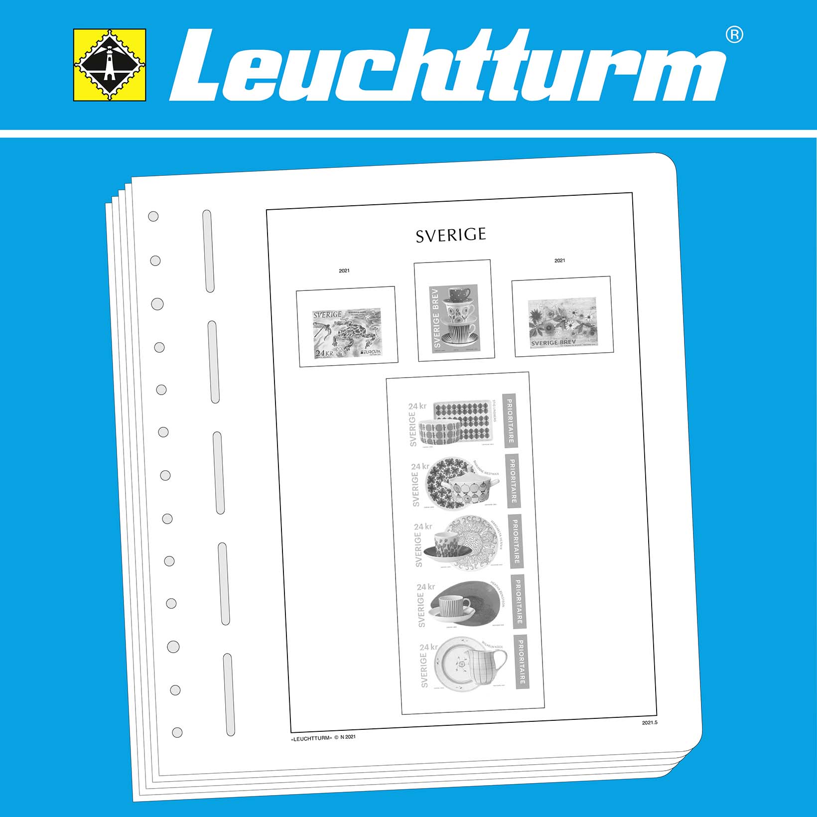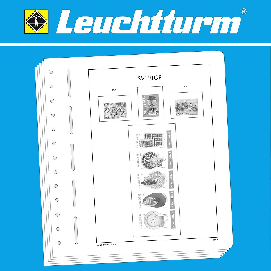 LEUCHTTURM Albenblätter (Format 270 x 297 mm/ 13-Loch-System) werden im detailgetreuen schwarz–weiß Offsetdruckauf alterungsbeständigem, holz- und säurefreiem Karton (170 g/m 2 ) gedruckt. Wir verzichten bewusst auf einen Farbdruck. Dies dient als Orientierungshilfe, damit Sie auf einen Blick sehen, welche Marken Ihnen noch fehlen. In der Größe des Markenvordrucks sind SF-Schutztaschen aus weichmacherfreier, glasklarer, entspiegelter Polystyrol-Folie auf den Albenkarton geklebt. Die Schutztaschen halten die Briefmarken präzise an ihrem Platz und verhindern ein Festkleben. Gleichzeitig bieten sie auch einen optimalen Schutz gegen Staub und Beschädigungen.