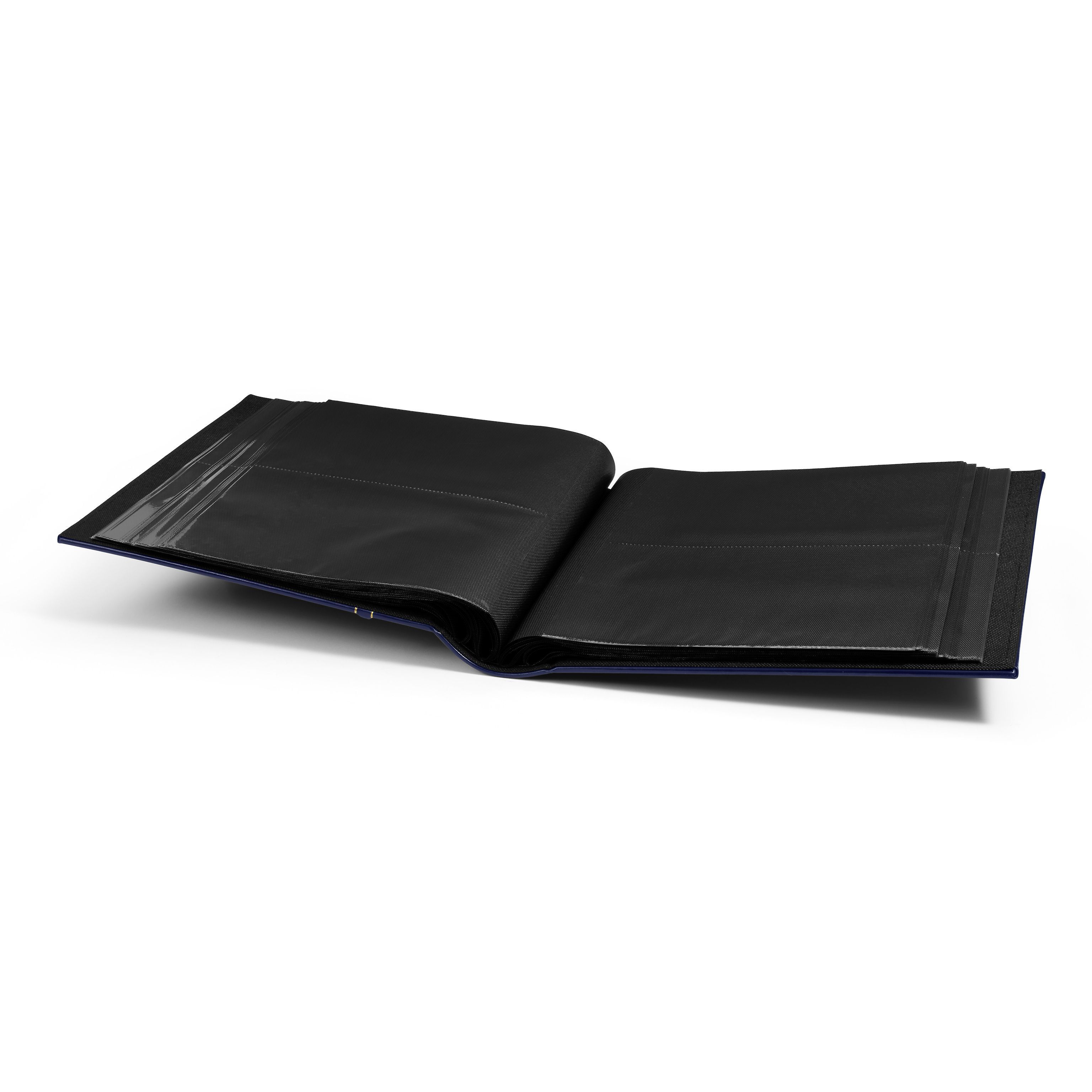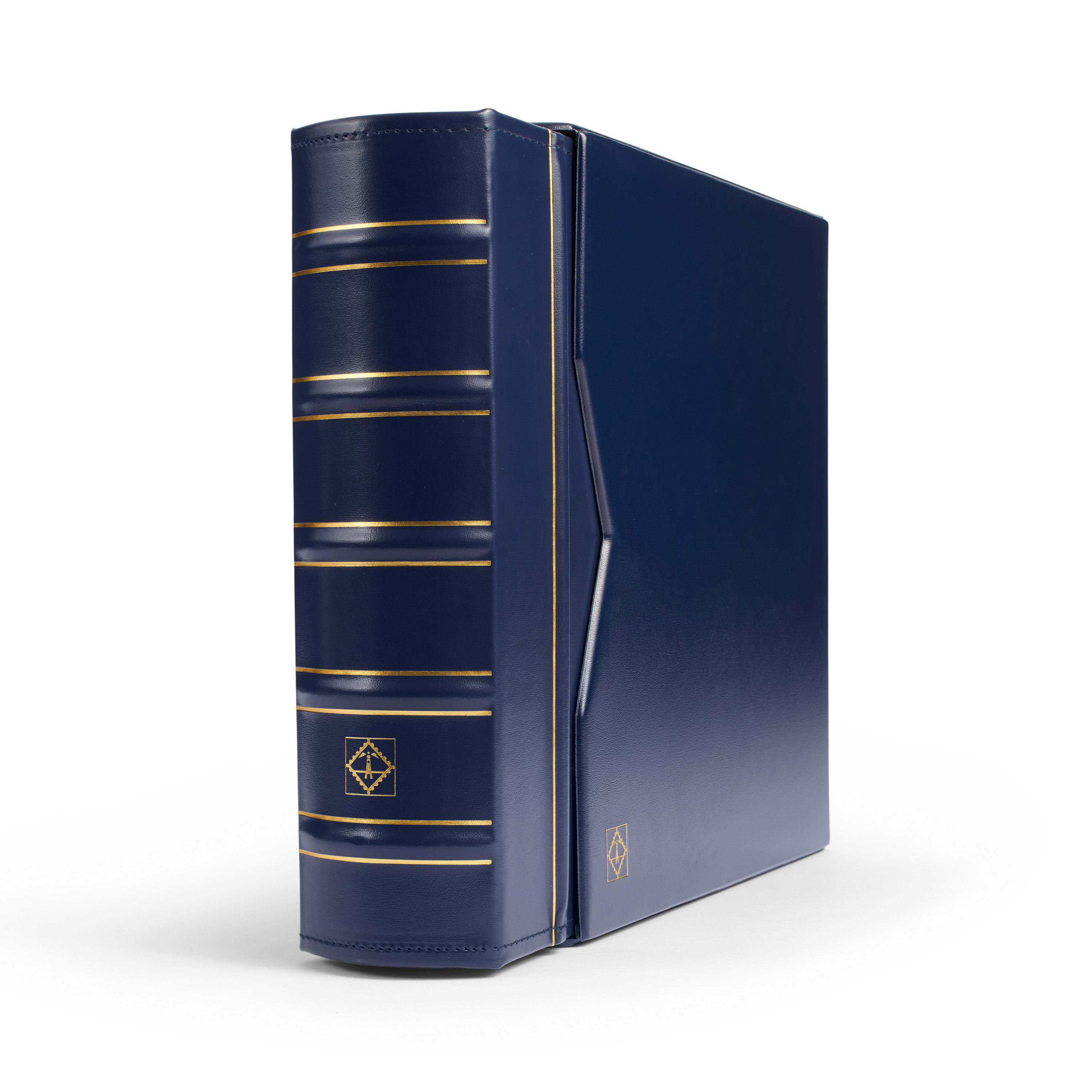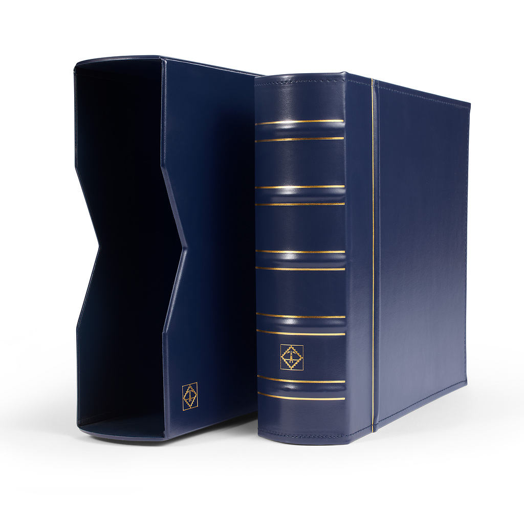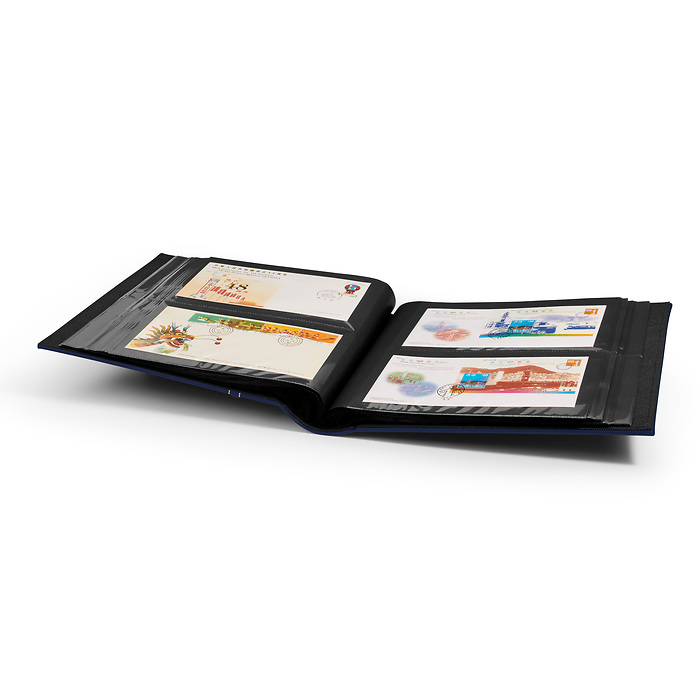 Album für 200 große Ersttagsbriefe (First-Day-Cover) und große Postkarten bis zum Format 243 x 133 mm. Mit 50 doppelseitigen, klarsichtigen, weichmacherfreien Hüllen und eingearbeiteten schwarzen Trennfolien, die mit dem Rücken verbunden sind. Der hochwertige, blaue Kunstledereinband ist buchbinderisch verarbeitet und mit einer Steppnaht versehen. Inkl. passender Schutzkassette. Außenformat: 305 x 320 x 97 mm.