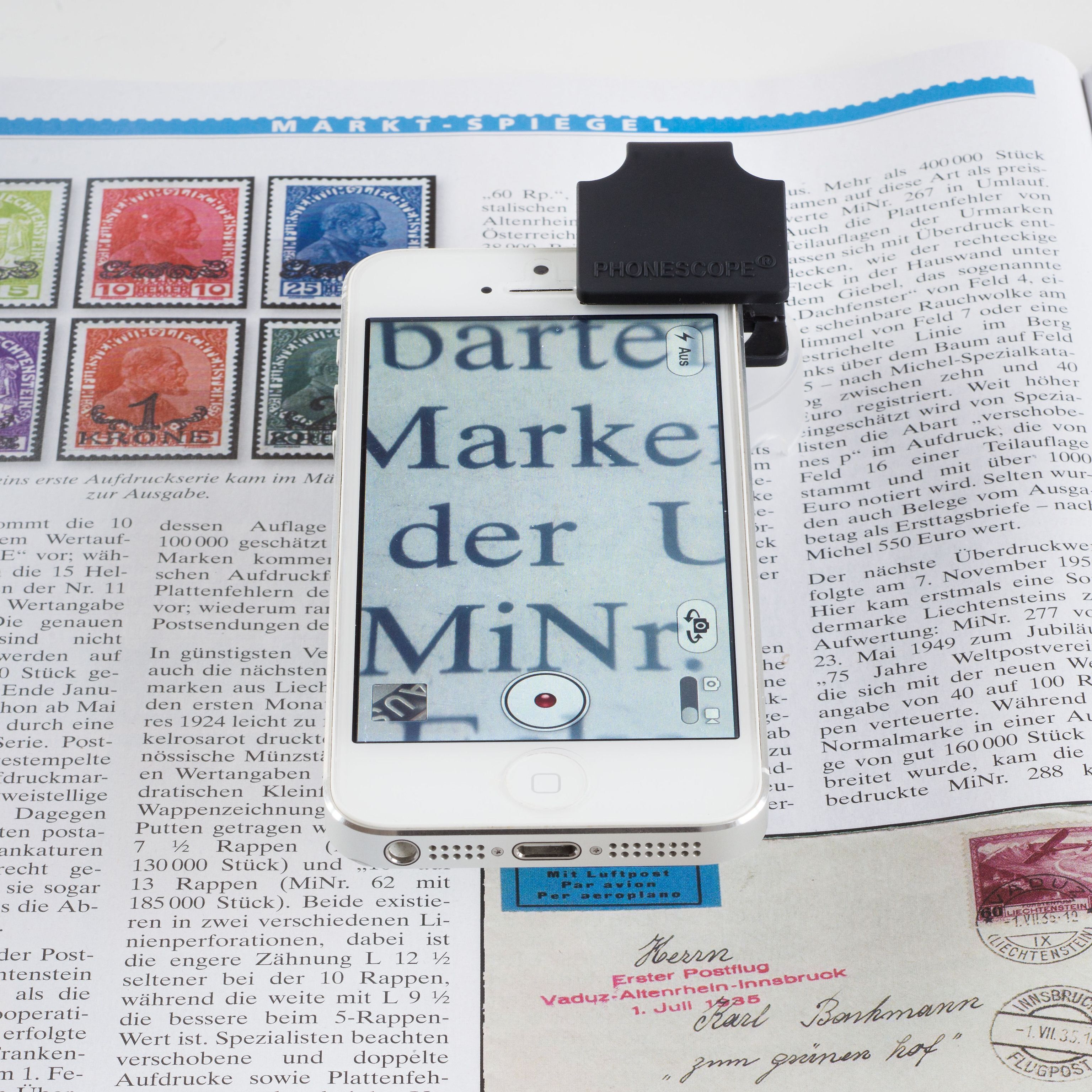 Die Makrolinse PHONESCOPE verwandelt Ihr Smartphone oder Tablet in ein vollfunktionsfähiges Digitalmikroskop mit bis zu 60-facher Vergrößerung. Über die Kamerafunktion des Smartphones können so feinste Details wie z.B. Prägekennzeichen auf Münzen, Briefmarkendruckverfahren u.v.m. erkannt bzw. geprüft werden. Die vergrößerten Detailansichten lassen sich als Foto oder Video speichern.