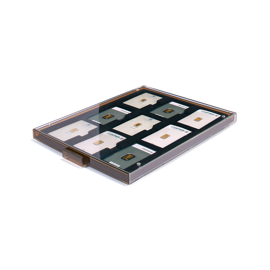 Die Münzbox bietet Platz für 9 Goldbarren in Blisterverpackung.
