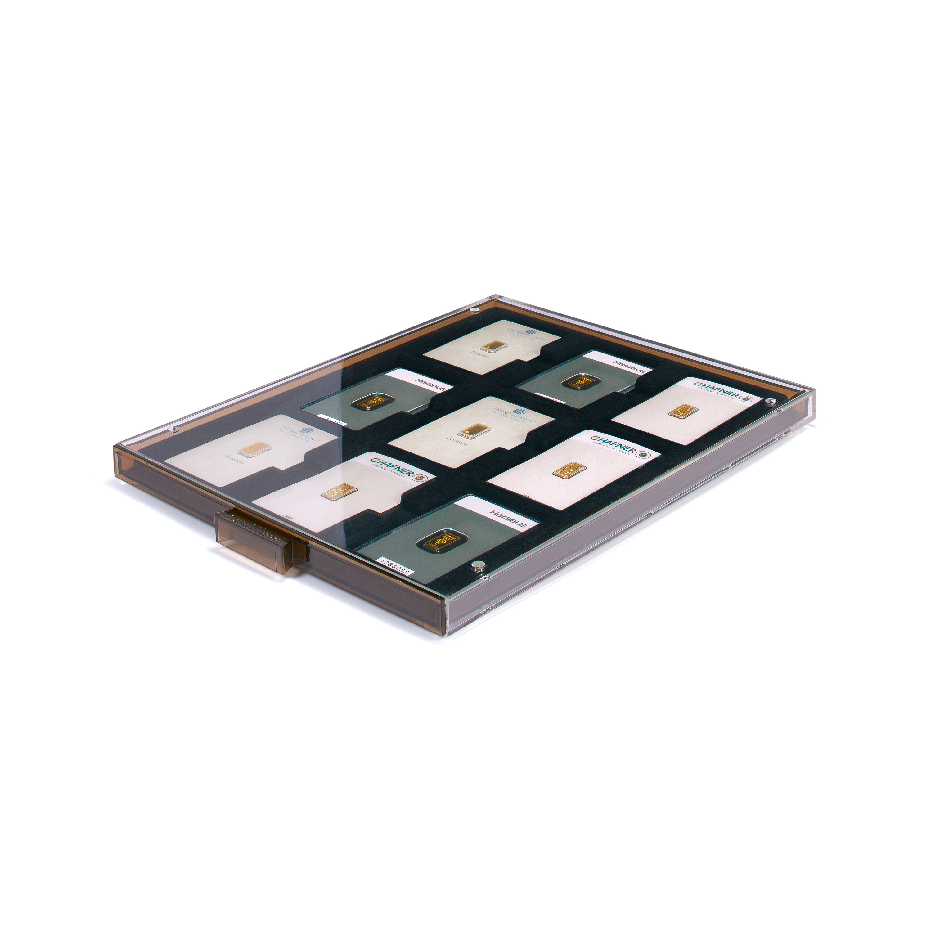 MB Münzbox mit 9 Fächern für Goldbarren in Blisterverpackung, mit schw. Einlage