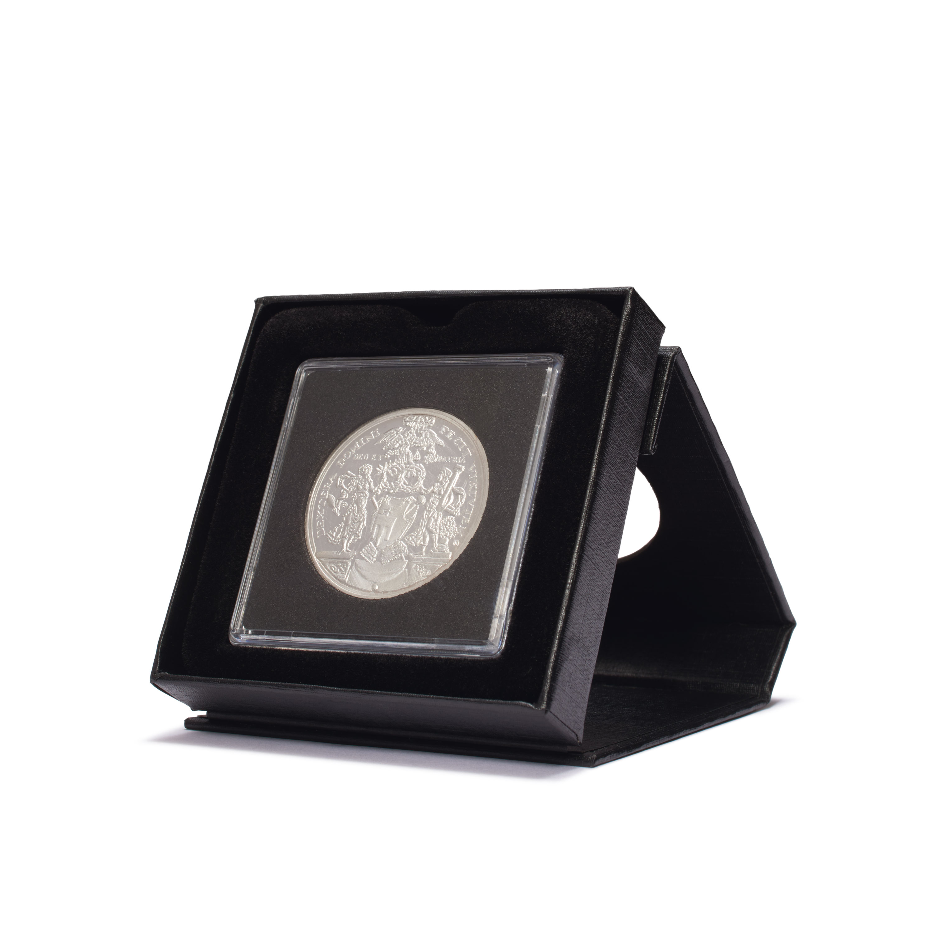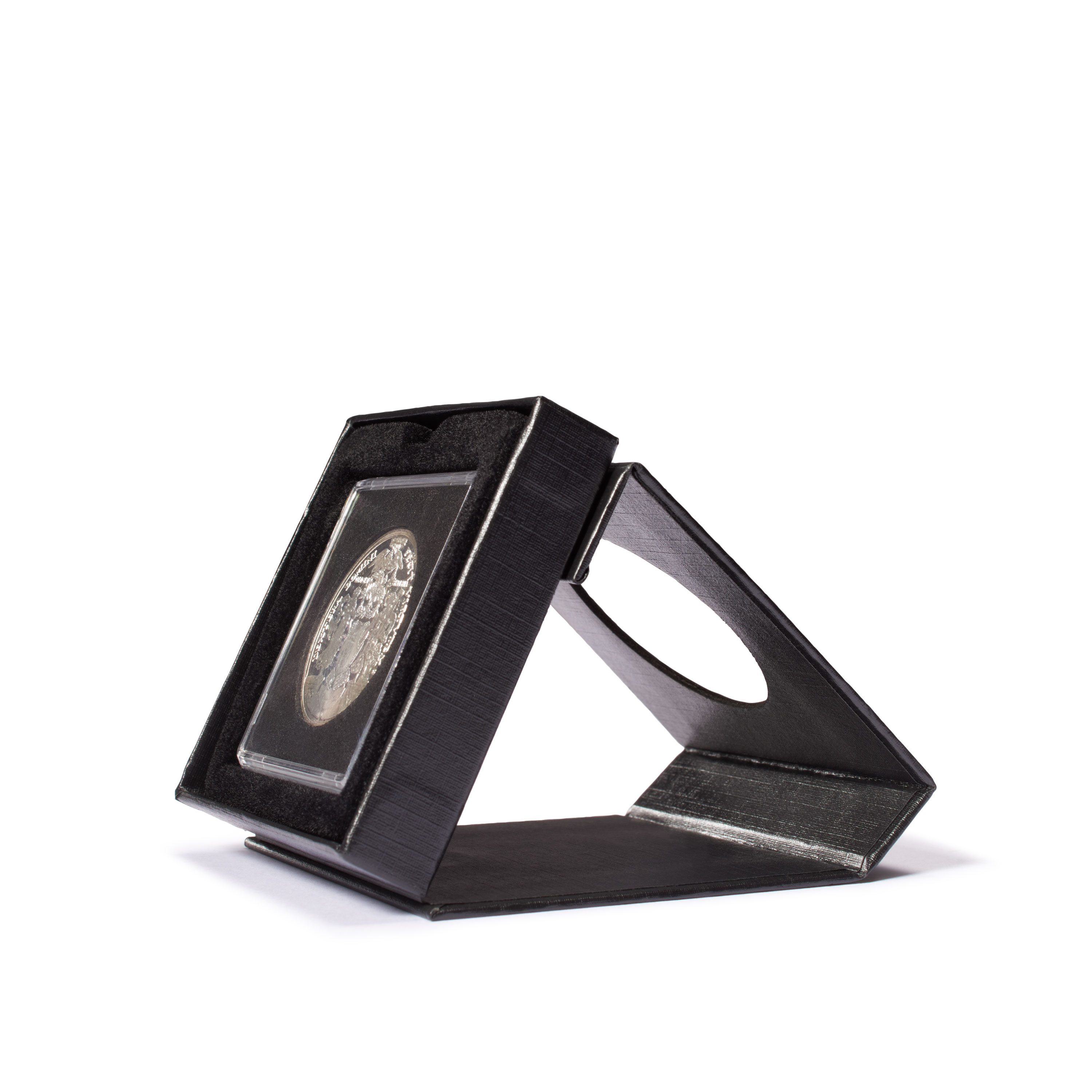 Schwarzes Münzetui aus stabilem Karton für QUADRUM-Kapseln. Der Clou: mit Sichtfenster zum Betrachten und Aufstellfunktion zur Präsentation der Münze. Einlage mit schwarzer, veloursartiger Oberfläche. Unauffälliger Magnetverschluss. Kapseln nicht im Lieferumfang enthalten.