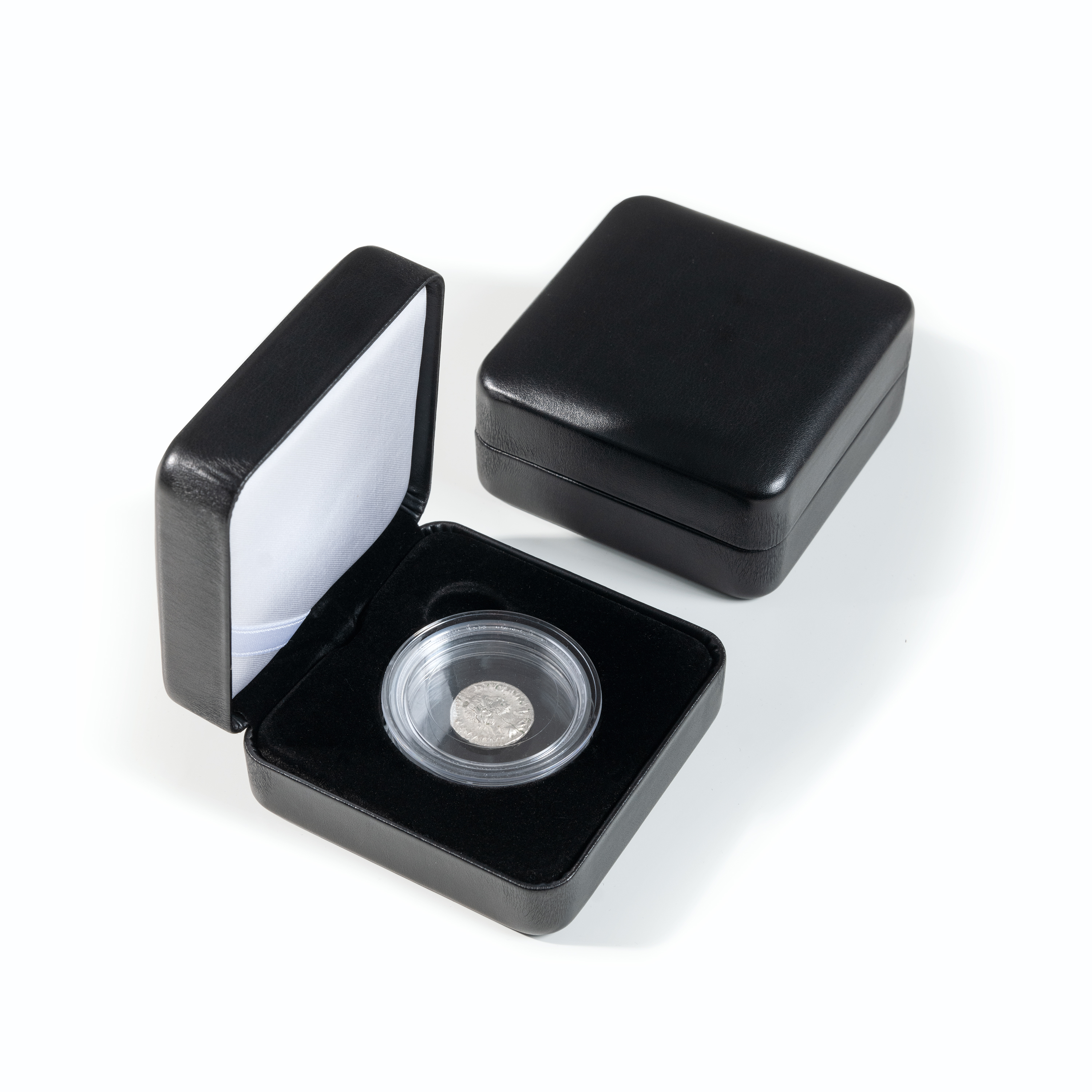 Stabiles Metallgehäuse mit schwarzem, fein genarbtem, wattiertem Kunstleder überzogen. Samteinlage mit schwarzer, veloursartiger Oberfläche und einem runden Feld, passend für LEUCHTTURM MAGIC CAPSULES. Im Deckelkissen befindet sich ein Satinbändchen, das zur Aufnahme eines evtl. vorhandenen Zertifikates dient. Außenformat: 78 x 78 x 39 mm. Lieferung ohne Kapsel.