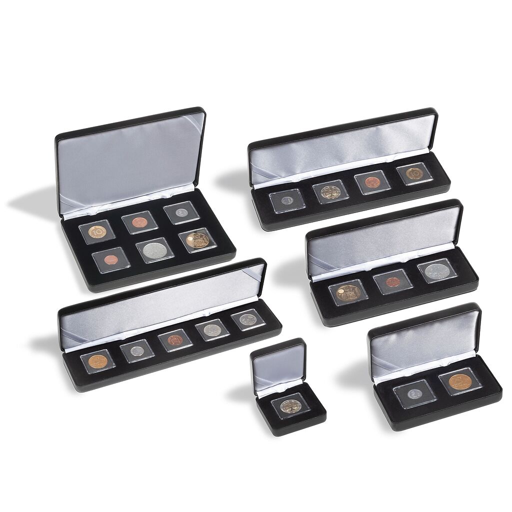 Zur anspruchsvollen Aufbewahrung von gekapselten Münzen empfehlen wir Ihnen diese edlen Münz-Etuis aus Metall. Der seidenmatte, lederähnliche Bezugsstoff sowie die Samteinlage geben diesen Etuis eine besonders edle Anmutung. Im Deckelkissen befindet sich ein Satinbändchen, das zur Aufnahme eines evtl. vorhandenen Zertifikates dient. Durch Ihren hochwertigen Metallkern ist dieses Etui neben der Aufbewahrung auch perfekt für den sicheren Versand geeignet. Passend für unsere QUADRUM Mini Kapseln. Kapseln nicht im Lieferumfang enthalten.