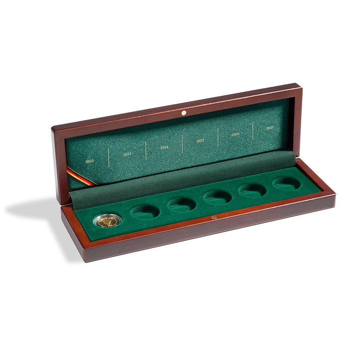 Dieses exklusive Münzetui ist speziell zur Aufbewahrung der 6 deutschen 20-Euro-Goldmünzen der Serie „Rückkehr der Wildtiere“ von 2022 bis 2027 in ihren Originalkapseln konzipiert. Das Etui besticht durch eine edle, mahagonifarbene Holzmaserung und bietet im Bodenteil sechs passgenaue Vertiefungen mit einer grünen, veloursartigen Oberfläche. Der hochwertige, themenspezifische Deckel- und Kissendruck sowie das mit grünem Satin ausgepolsterte Deckelkissen verleihen dem Etui eine besonders elegante Note. Ein praktisches Zertifikatsbändchen im Deckelkissen und ein sicherer, unauffälliger Magnetverschluss runden das Design ab. Mit einem Außenformat von 260 x 80 x 30 mm ist dieses Etui die perfekte Ergänzung für Ihre Münzsammlung. Kapseln sind nicht im Lieferumfang enthalten.