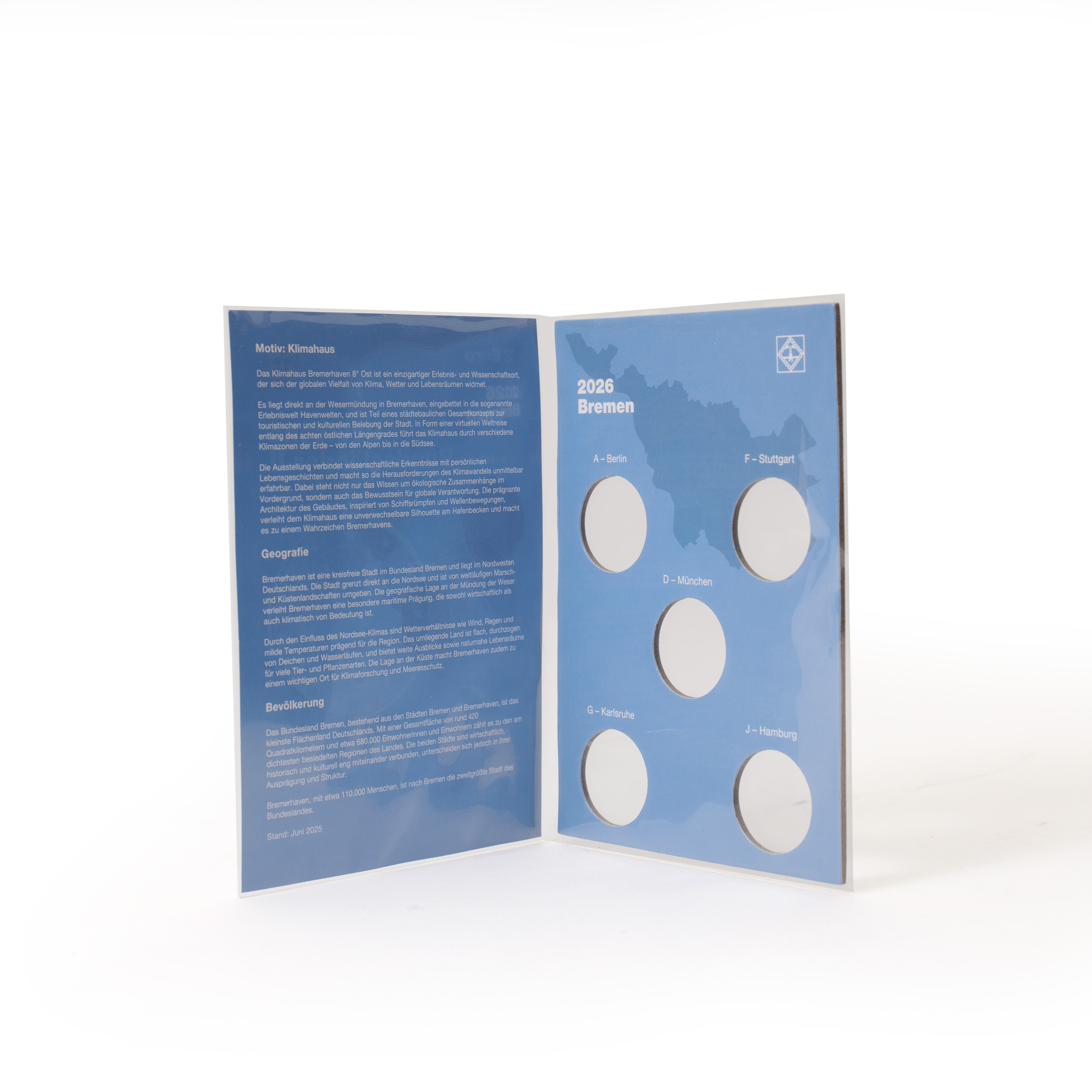 Sammelkarte aus stabilem Karton mit Ausstanzungen für die fünf deutschen 2-Euro-Gedenkmünzen 2025 „Klimahaus Bremerhaven“ (Prägebuchstaben A, D, F, G, J). Die Münzen sind in einer glasklaren, weichmacherfreien Kunststofffolie untergebracht und beidseitig betrachtbar. Die Karte enthält zudem Hintergrundinformationen sowie Bildmaterial zu den Münzen. Im ausgeklappten Zustand misst die Karte 212 x 144 mm, zusammengeklappt hat sie die handliche Größe von 106 x 144 mm – ideal auch als Geschenkverpackung.