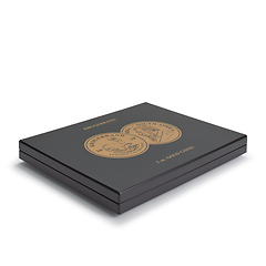 Hochwertige, schwarze Münzkassette zur Unterbringung von 30 Krügerrand Goldmünzen (1 Oz.) in LEUCHTTURM Kapseln (GRIPS33). 1 Einlage mit schwarzer, veloursartiger Oberfläche und 30 runden Feldern (Ø 39 mm). Edler, goldfarbener Deckel- und Kissendruck mit Münzmotiv. Deckelkissen mit schwarzem Satin gepolstert. Sicherer und unauffälliger Magnetverschluss. Außenformat: 305 x 30 x 245 mm. Kapseln nicht im Lieferumfang enthalten.