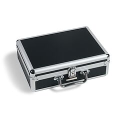 Münzkoffer im S-Format. Ausgepolsterter Kofferdeckel. Komplett ausgekleidet mit schwarzem Velours. Abschließbar (2 Schlüssel). Metallbeschläge. Außenformat: 292 x 97 x 213 mm.