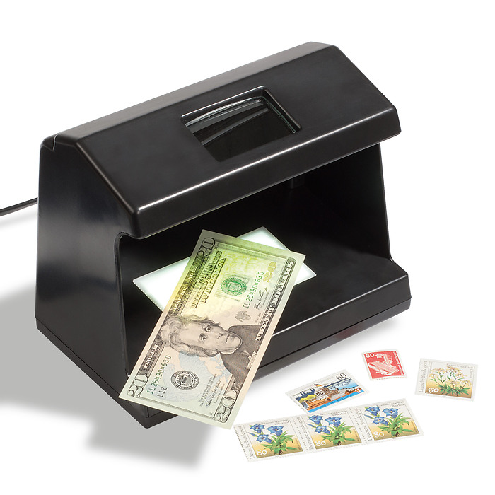 Prüfen Sie mit dem Multi-Tester Briefmarken, Münzen, Banknoten, Kreditkarten u.v.m. Prüfen Sie z.B. die fluoreszierenden Sicherheitsmerkmale von Geldscheinen, um das Original von der Fälschung zu unterscheiden. Ideal für Ihr Hobby oder Geschäft. Aufgrund der leistungsstarken 9W-UV-Auflichtröhre (2G7 9W) werden UV-aktive Farbpartikel selbst bei Tageslicht sichtbar. Durch Weißlicht von unten (4W-Lampe) ist auch eine Wasserzeichen-Erkennung möglich. Mit der integrierten Lupe betrachten Sie Ihr (Sammel)-Objekt in 2-facher Vergrößerung. Betrieb mit 220 – 240 V-Netzanschluß. Schwarzes Kunststoffgehäuse. Abmessungen: 200 x 120 x 160 mm