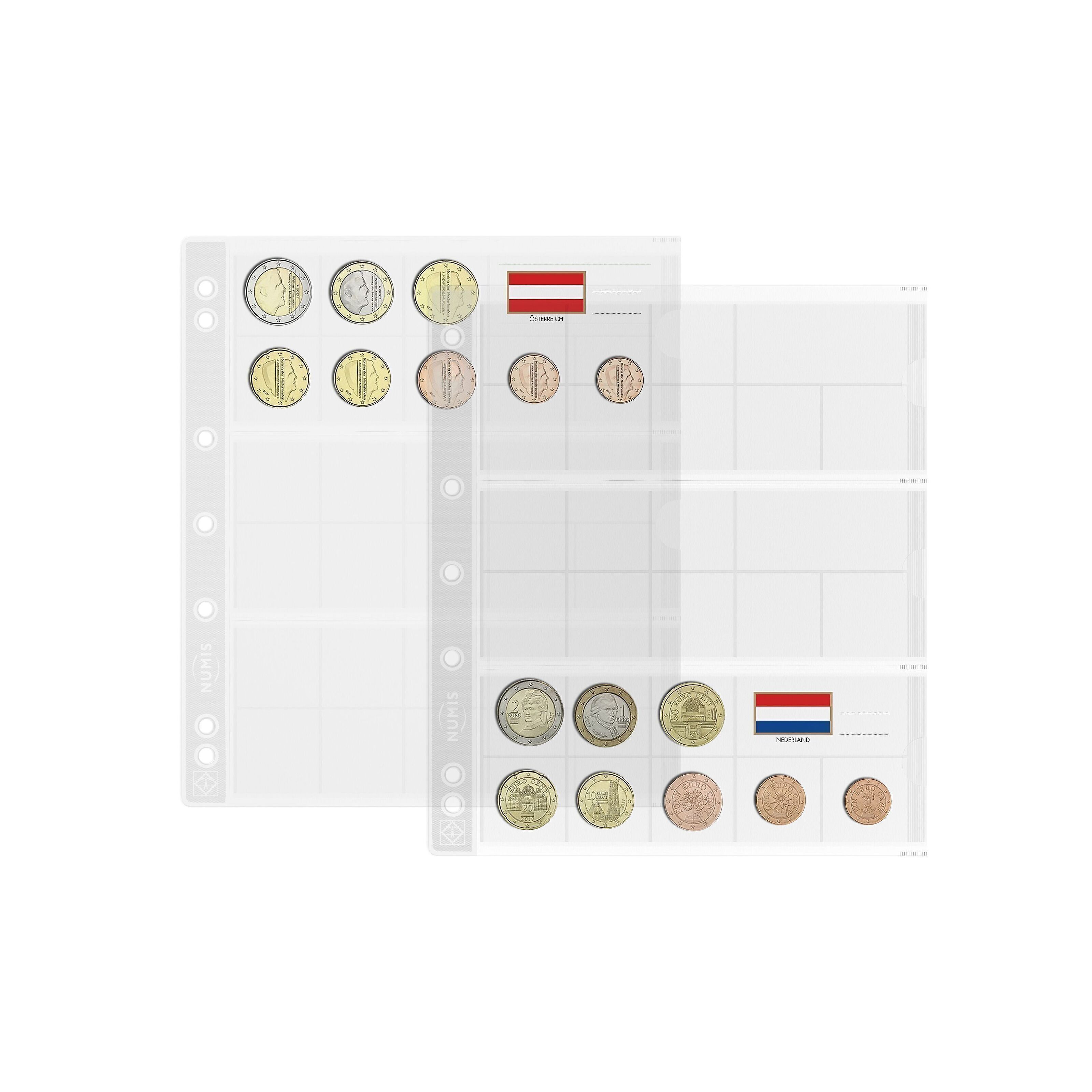 NUMIS Münzhüllen für 3 komplette Euro-Kursmünzensätze, inkl. 27 Flaggenschilder der alten und neuen Euro-Länder, Hüllenformat: 193 x 217 mm