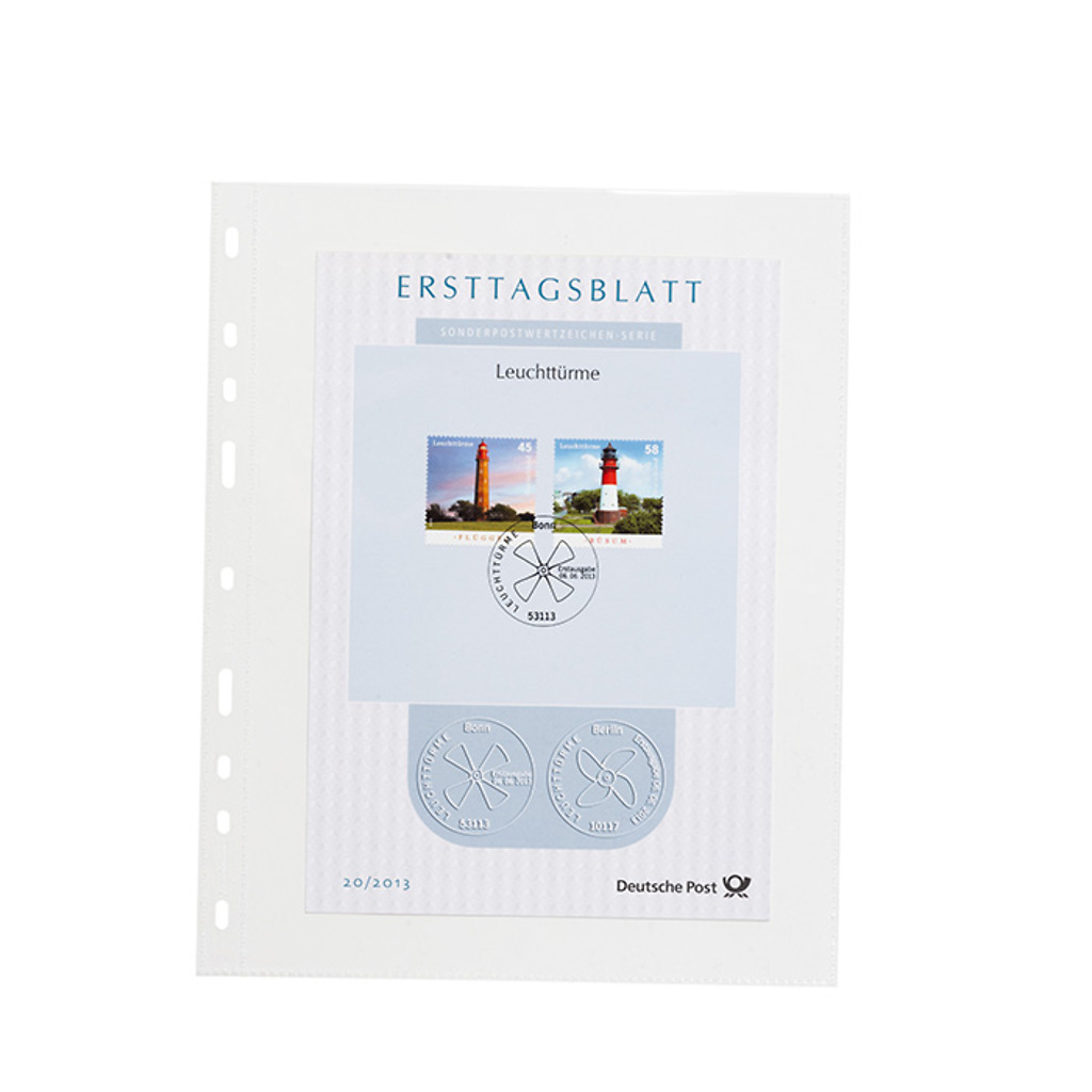 Die transparenten LEUCHTTURM Kunststoffhüllen SH252 mit verschiedenen Einteilungen sind ideal zur Aufbewahrung von z.B. Banknoten, Karten im A6-Format und Dokumenten aller Art bis zum Format 245 x 180 mm (> DIN A5). Die Hüllen sind passend für alle LEUCHTTURM OPTIMA-Ringbinder. Die Taschen bieten echten Schutz durch vollständige Abdeckung der eingelegten Sammelstücke. Dokumentenecht (100 % weichmacher- und säurefrei). Material: PP (Polypropylen). Außenformat: 252 x 202 mm. 50er Pack.