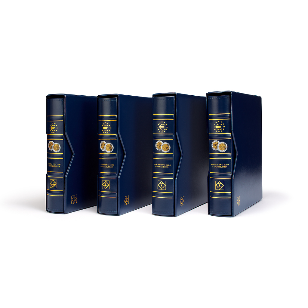 Classic OPTIMA Münzalbum zur Unterbringung von allen europäischen 2-Euro-Gedenkmünzen (ausser Europas 2-Euro-Gemeinschaftsausgaben). Sammeln Sie Ihre 2-Euro-Gedenkmünzen in 3 sich ergänzenden Ausführungen. Das Thema „2-Euro-Gemeinschaftsausgaben“ wird in einem separaten Album thematisiert (Art.-Nr. 343 382). Inkl. Münzhüllen und Vordruckblätter mit Abbildungen sowie allen wichtigen Hintergrundinformationen zu Ausgabejahr, Münzmotiven und Ausgabeanlässen. Aktualisierung durch jährlich erscheinende Nachträge. Außenformat Album: 245 x 270 mm; Außenformat Schutzkassette: 250 x 280 x 60 mm