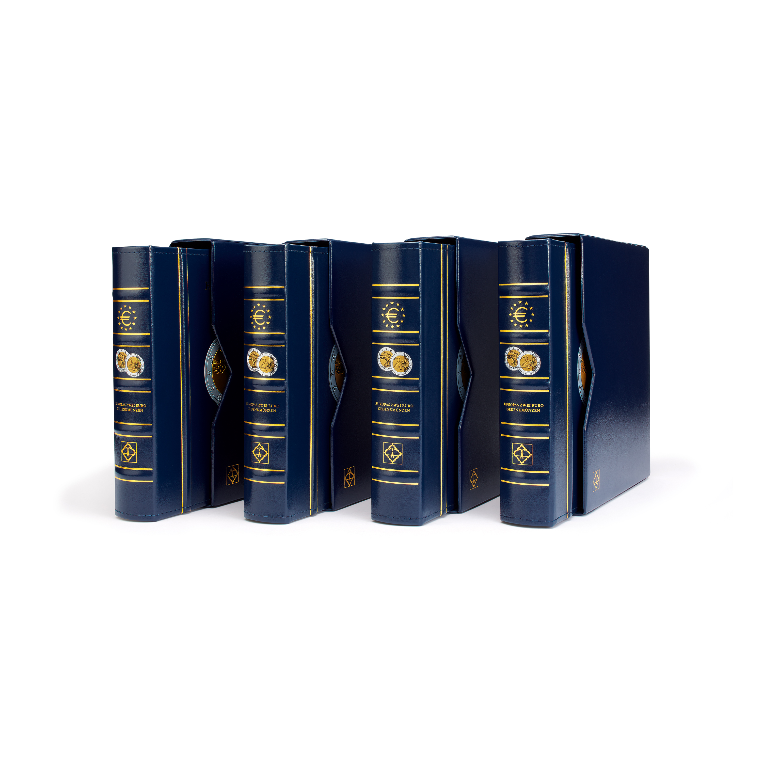 Inhalt: 12 OPTIMA-Münzhüllen und 12 Vordruckblätter. Folgende Themen sind enthalten: Sämtliche* seit 2004 erschienenen europäischen 2-Euro-Gedenkmünzen bis einschließlich 2013 inkl. der deutschen 2-Euro-Gedenkmünzen („Bundesländer-Serie“) mit Berücksichtigung aller 5 Prägestätten bis einschließlich 2013. Album inkl. passender Schutzkassette
