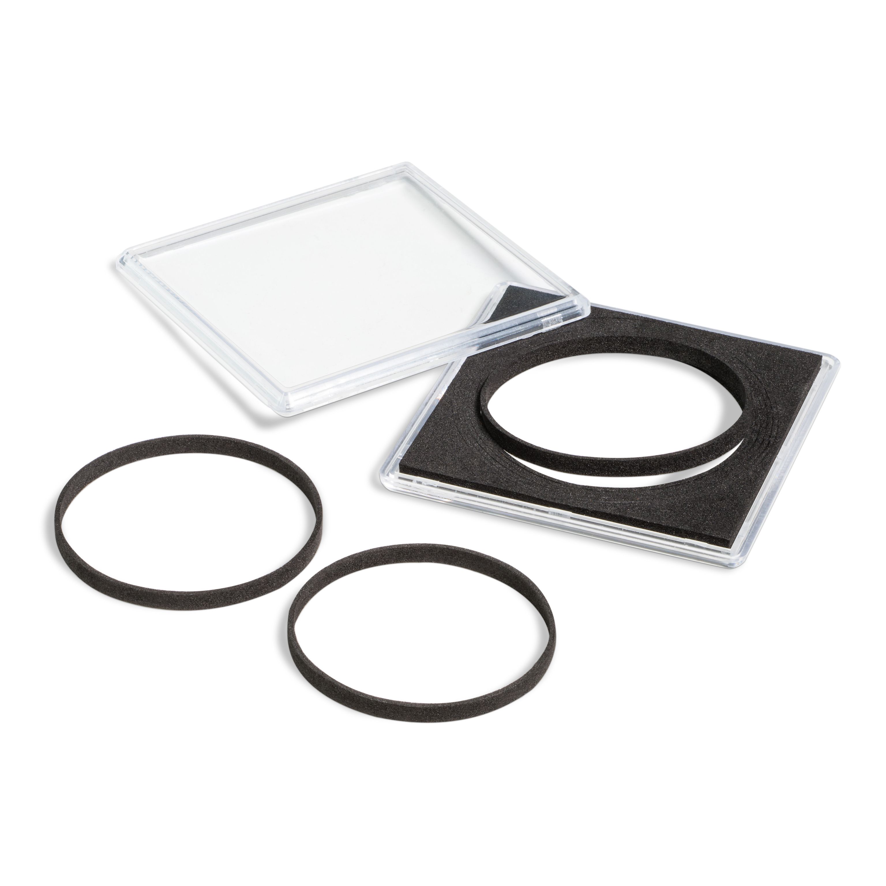 Münzkapseln zur Unterbringung von verschiedenen, extra großen Münzen / Medaillen in einem System. Mit 8 einzeln herausnehmbaren Distanzringen zur Unterbringung von Münzen / Medaillen mit einem Durchmesser von 42 bis 58 mm und einer maximalen Höhe von 4,5 mm. Ringe aus schwarzem Schaum (säure- und weichmacherfrei). Außenmaße: 67,25 x 67,25 x 7,8 mm. 5 Stück pro Packung.