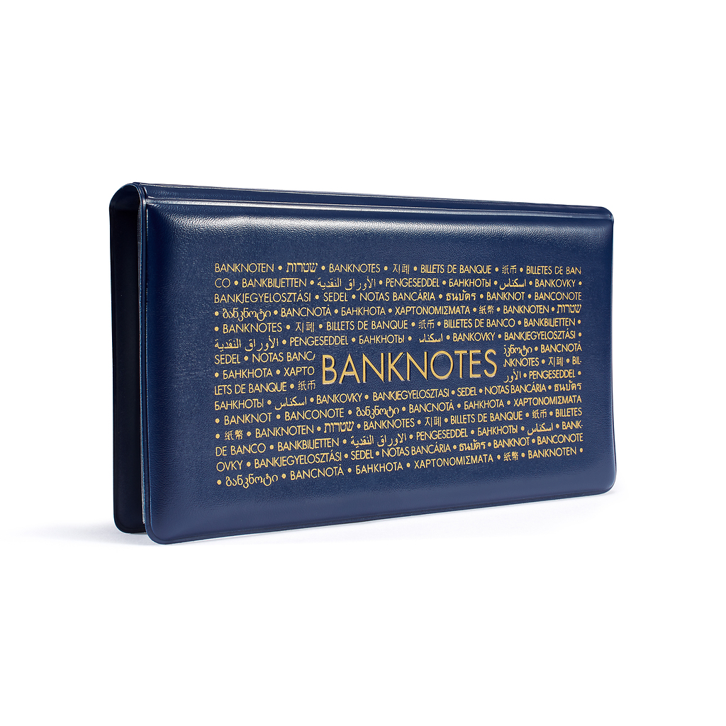 Handliches Taschenalbum mit 20 Hüllen für Banknoten bis 182 x 92 mm (B/H). Die klarsichtigen Hüllen ermöglichen das Betrachten von Vorder- und Rückseite der Banknoten. Aufgrund des handlichen Formates paßt das Taschenalbum problemlos in Hand-, Akten- und Anzugtaschen und eignet sich damit hervorragend für unterwegs und Tauschtage. Wattierter Einband. Goldfarbene Deckelprägung. Farbe: Dunkelblau. Außenformat: 205 x 25 x 120 mm (L/B/H)