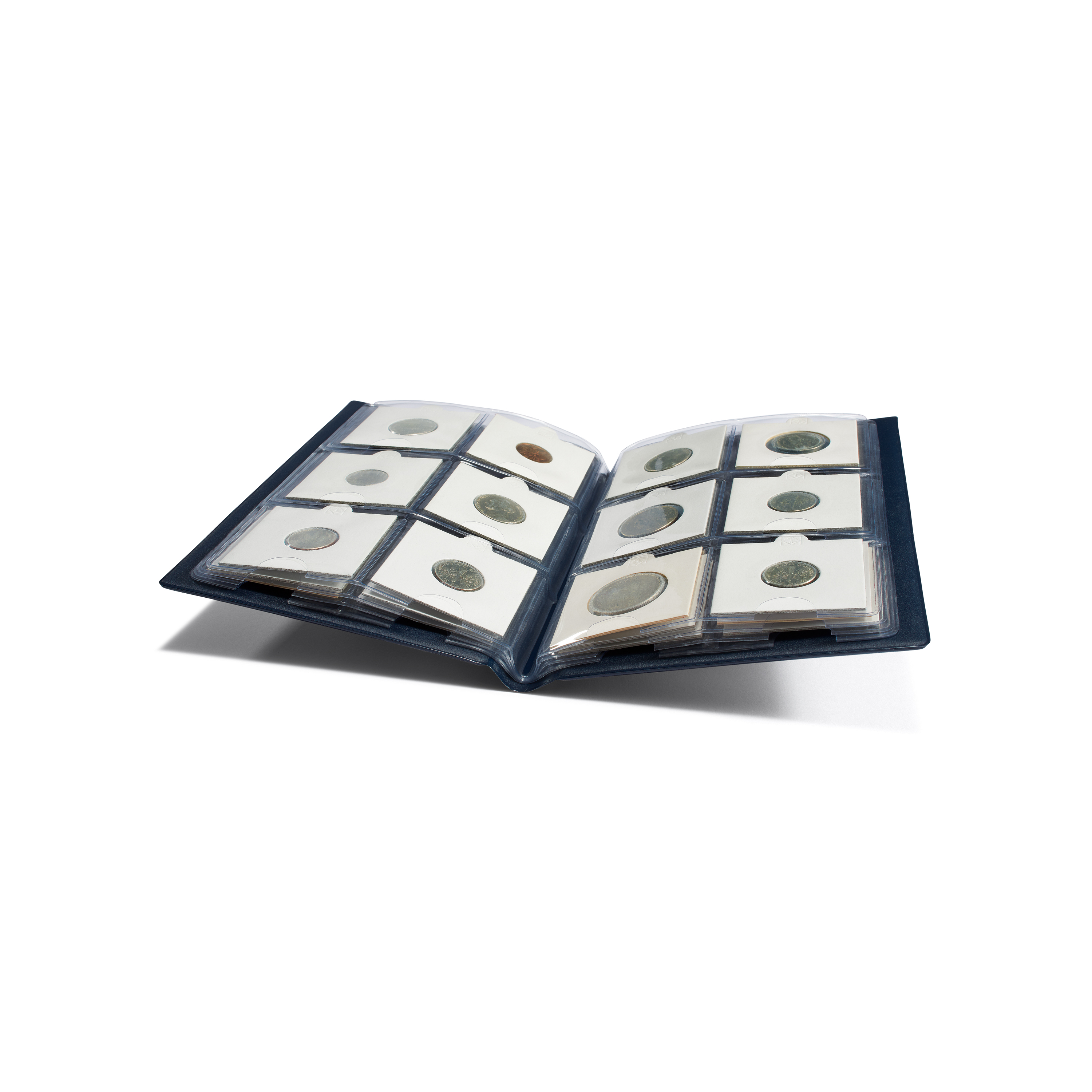Inhalt: 10 Münzblätter für jeweils 6 Kartonrähmchen im Format 50 x 50 mm. Wattierter Einband. Deckelprägung „NUMIS“ in Silber. Außenformat: 130 x 190 mm. Farbe: Dunkelblau