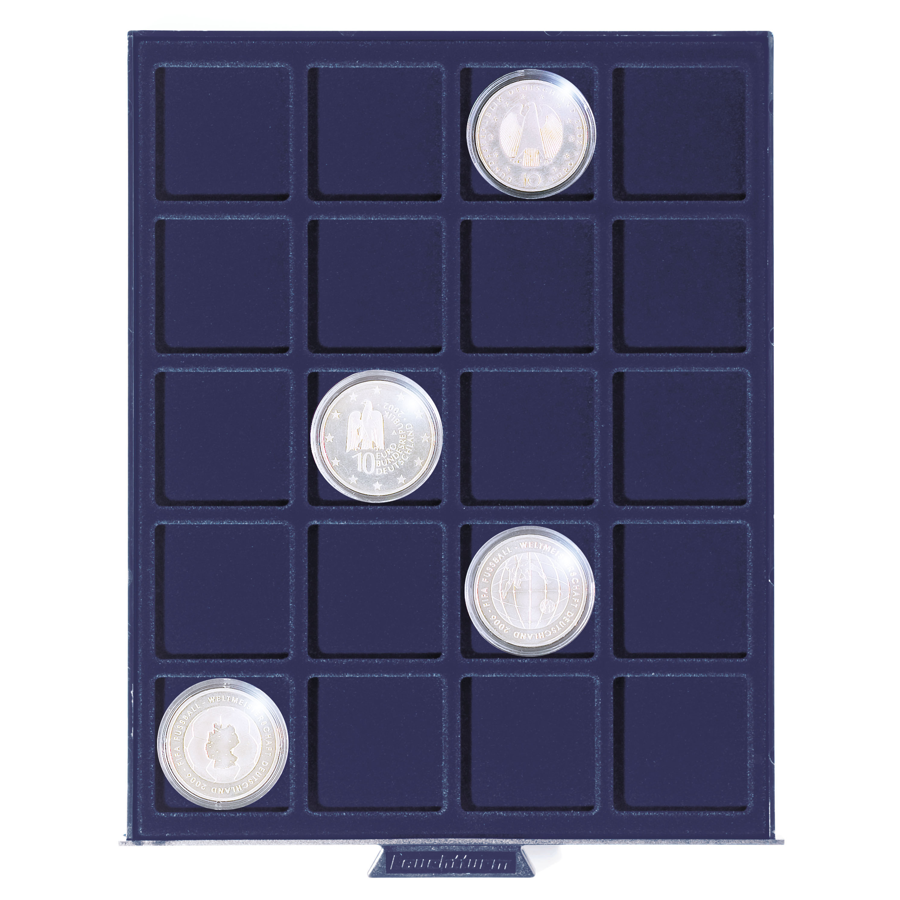 Diese Münzenbox SMART ist mit einer samtblauen Einlage ausgestattet. Die  Schublade für diese Einlage ist glasklar. Diese Box ist mit 20 eckigen Facheinteilungen für Münzen bis zu einem Duchmesser von 41 mm geeignet. Außenformat: 195 x 19 x 250 mm.