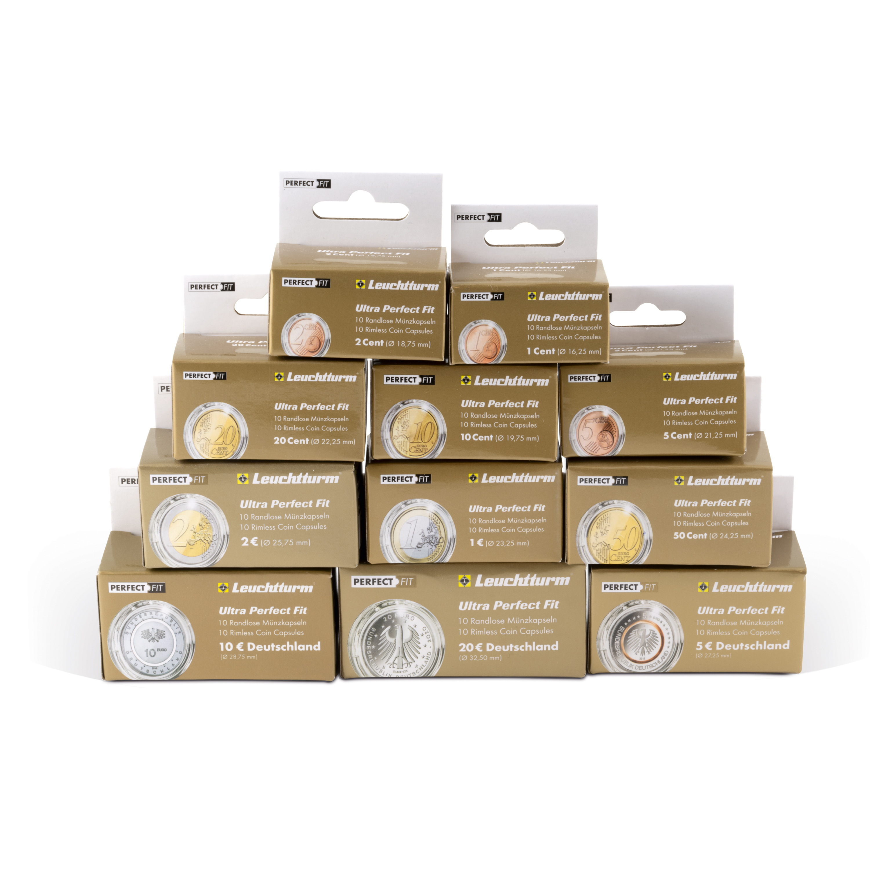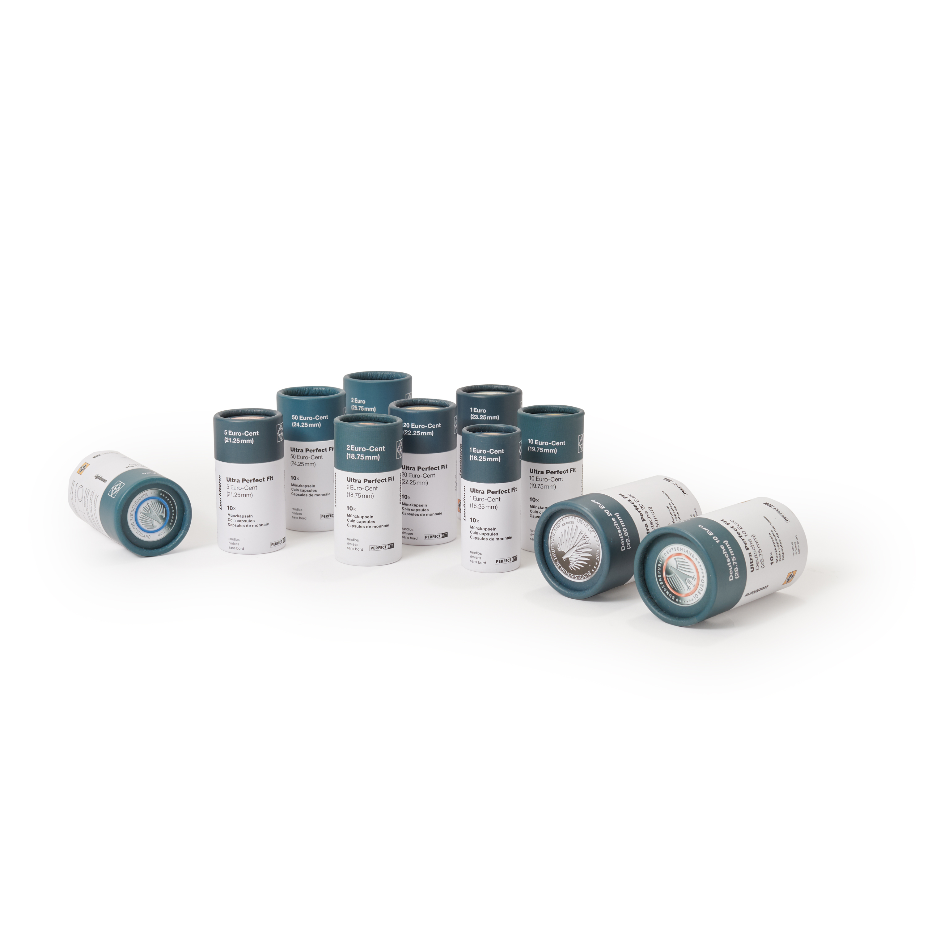 110 Münzkapseln aus hochwertigem, kratzfestem Kunststoff. Festgreifender und gleichzeitig leicht zu öffnender Verschluß (die Kapseln sind ohne Griffrand). Das LEUCHTTURM Münzkapsel-Sortiment setzt sich wie folgt zusammen: