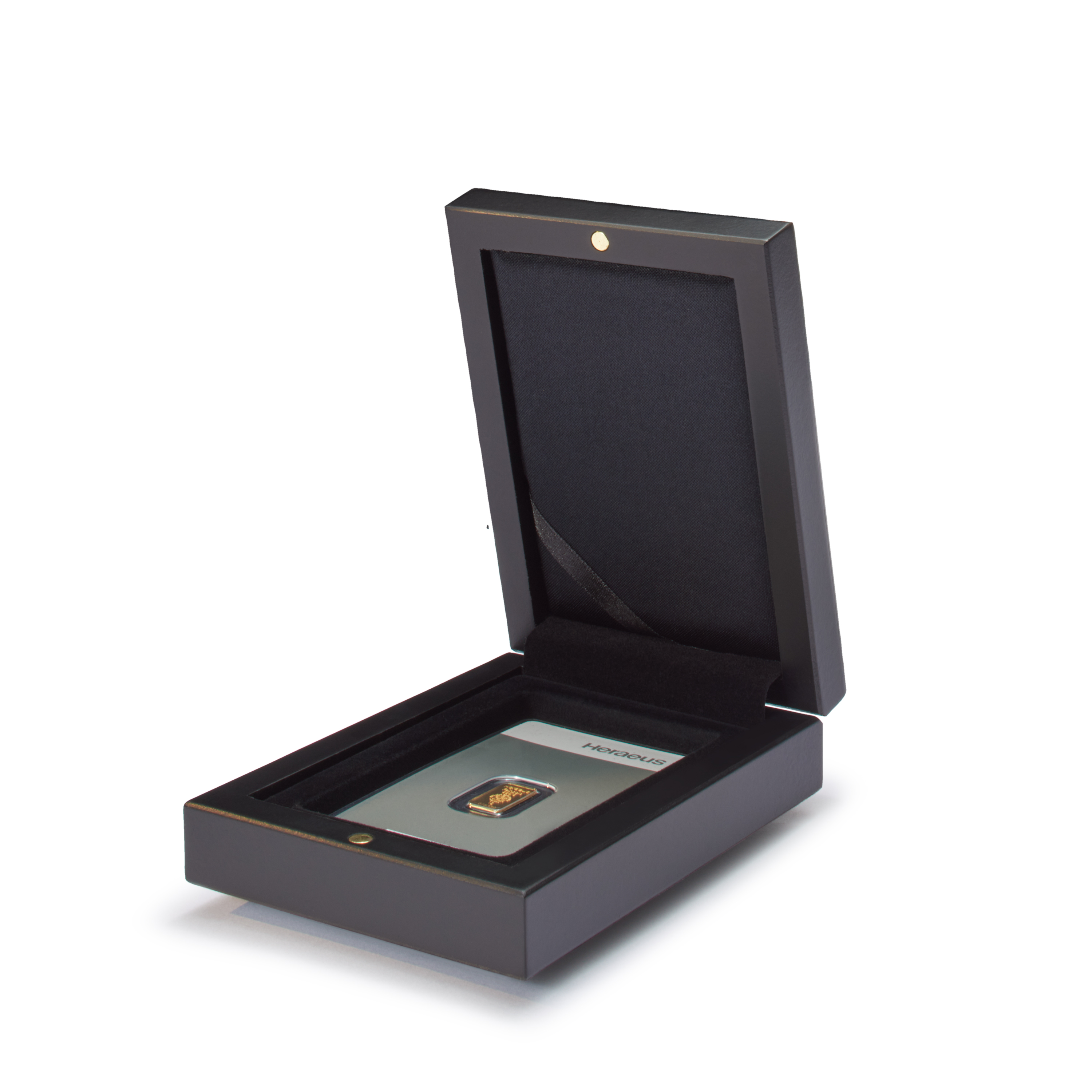 Elegantes Etui in schwarzer Holzmaserung zur stilvollen Aufbewahrung von Goldbarren in Blisterkarten. Der Deckel ist innen mit weichem, schwarzem Satin gepolstert, während das Bodenteil eine edle, veloursartige Oberfläche aufweist. Dank eines integrierten „Kipp-Mechanismus“ lassen sich die Barren besonders leicht entnehmen. Außenformat des Etuis: 120 x 90 x 34 mm, passend für Blisterkarten im Format 86 x 54 mm.