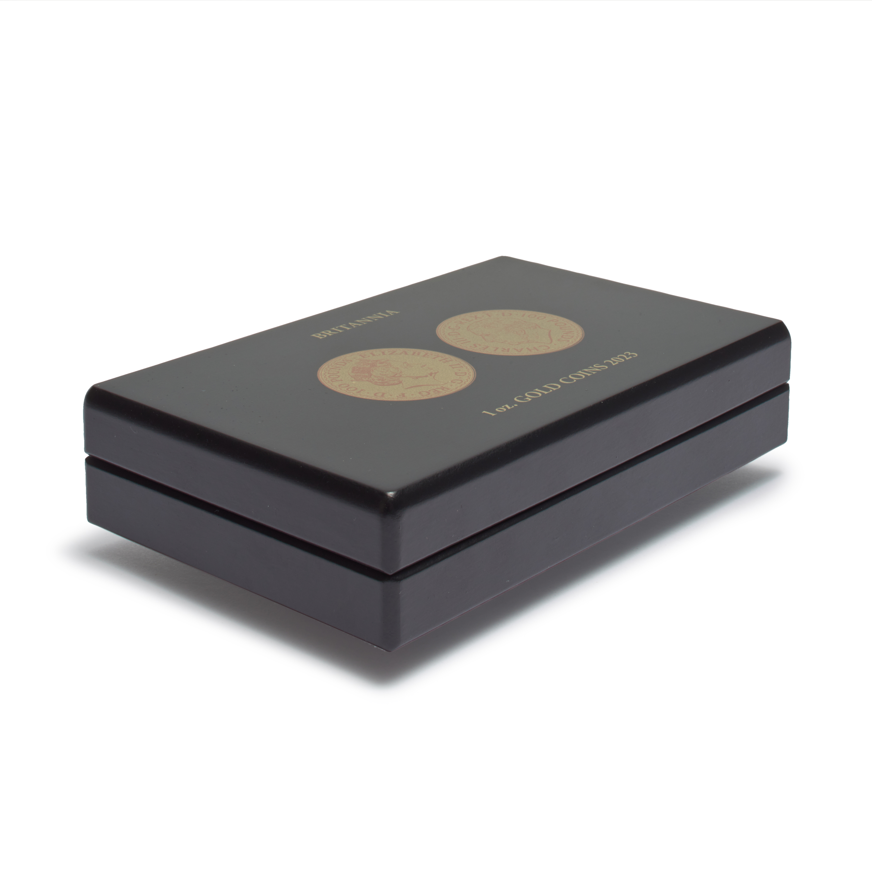 - Schwarzes Münzetui für 2 Britannia Goldmünzen (1oz.), Jahrgang 2023, in Kapseln