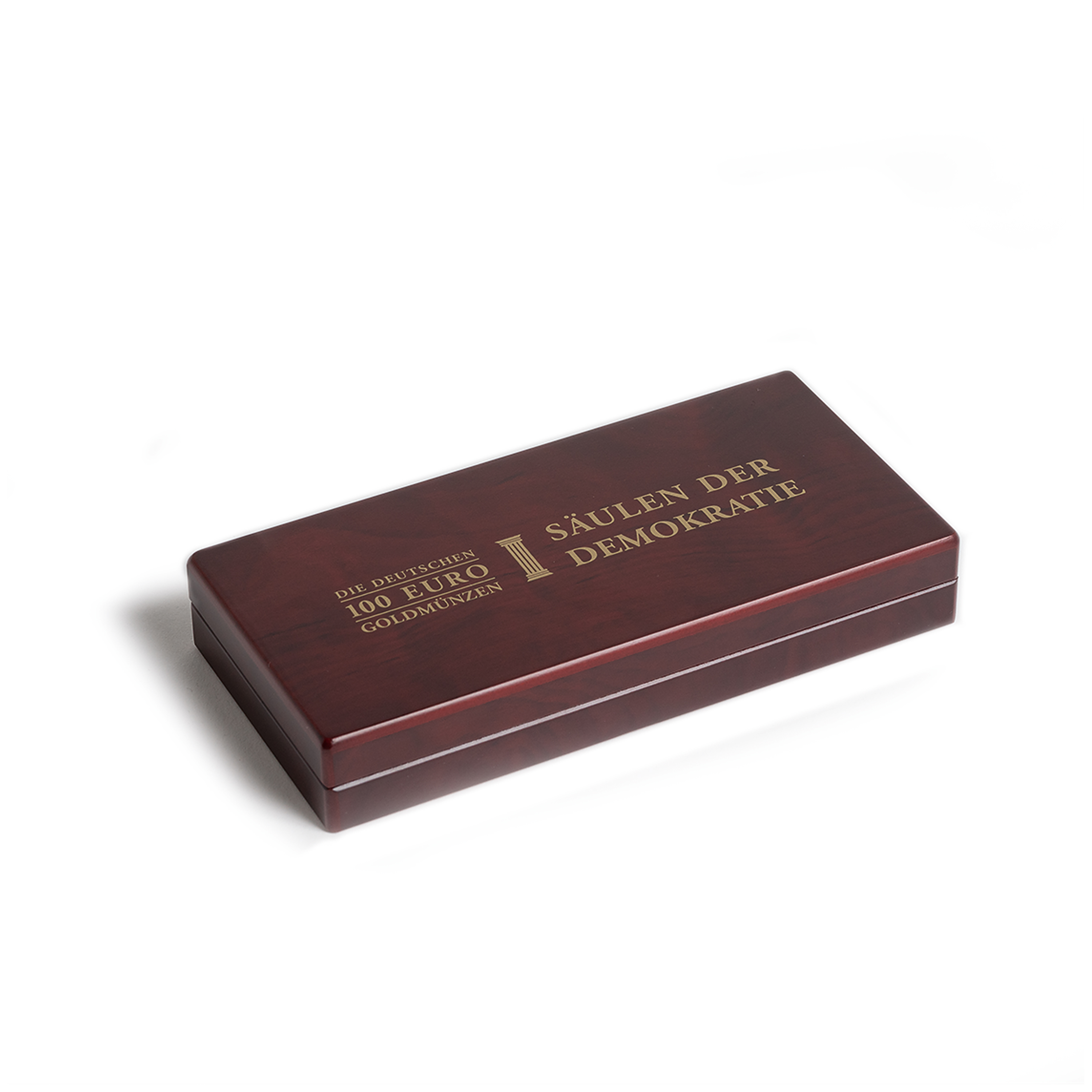 Münzetui in edler, mahagonifarbener Holzmaserung zur Unterbringung der 3 deutschen 100-Euro-Goldmünzen der Serie „Säulen der Demokratie“ in Originalkapseln. 1 Einlage mit roter, veloursartiger Oberfläche und 3 runden Feldern (Ø 33,5 mm). Goldfarbener Deckel- und Kissendruck mit Münzmotiv. Deckelkissen mit rotem Satin gepolstert. Sicherer und unauffälliger Magnetverschluss.