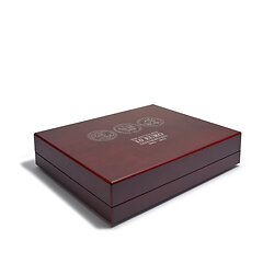 Diese hochwertige Münzkassette in edler, mahagonifarbener Holzmaserung bietet Platz für alle 104 deutschen 10-Euro-Gedenkmünzen (Stempelglanz) in Kapseln (InnenØ 32,5 mm). Inkl. 4 Einlagen mit blauer, veloursartiger Oberfläche, runden Feldern (Ø 38 mm) und Jahreszahlenaufdruck. Besondere Stabilität der Einlagen durch Holzrahmung. Edler, silberfarbener Deckel- und Kissendruck mit verschiedenen Münzmotiven. Deckelkissen mit blauem Satin gepolstert. Sicherer und unauffälliger Magnetverschluss. Außenformat: 330 x 270 x 70 mm